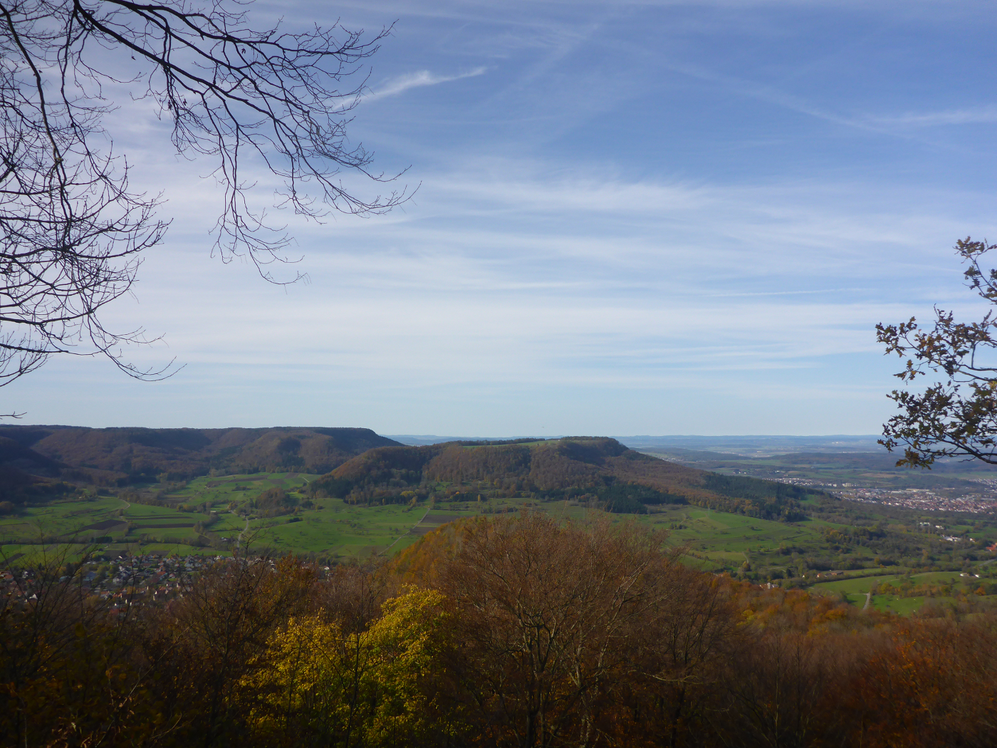Blick vom Riedernberg nach Westen. Im Tal unten Talheim. Im Vordergrund der Farrenberg mit seinem Segelfluggelände. Im Hintergrund der Hirschkopf und Dreifürstenstein.