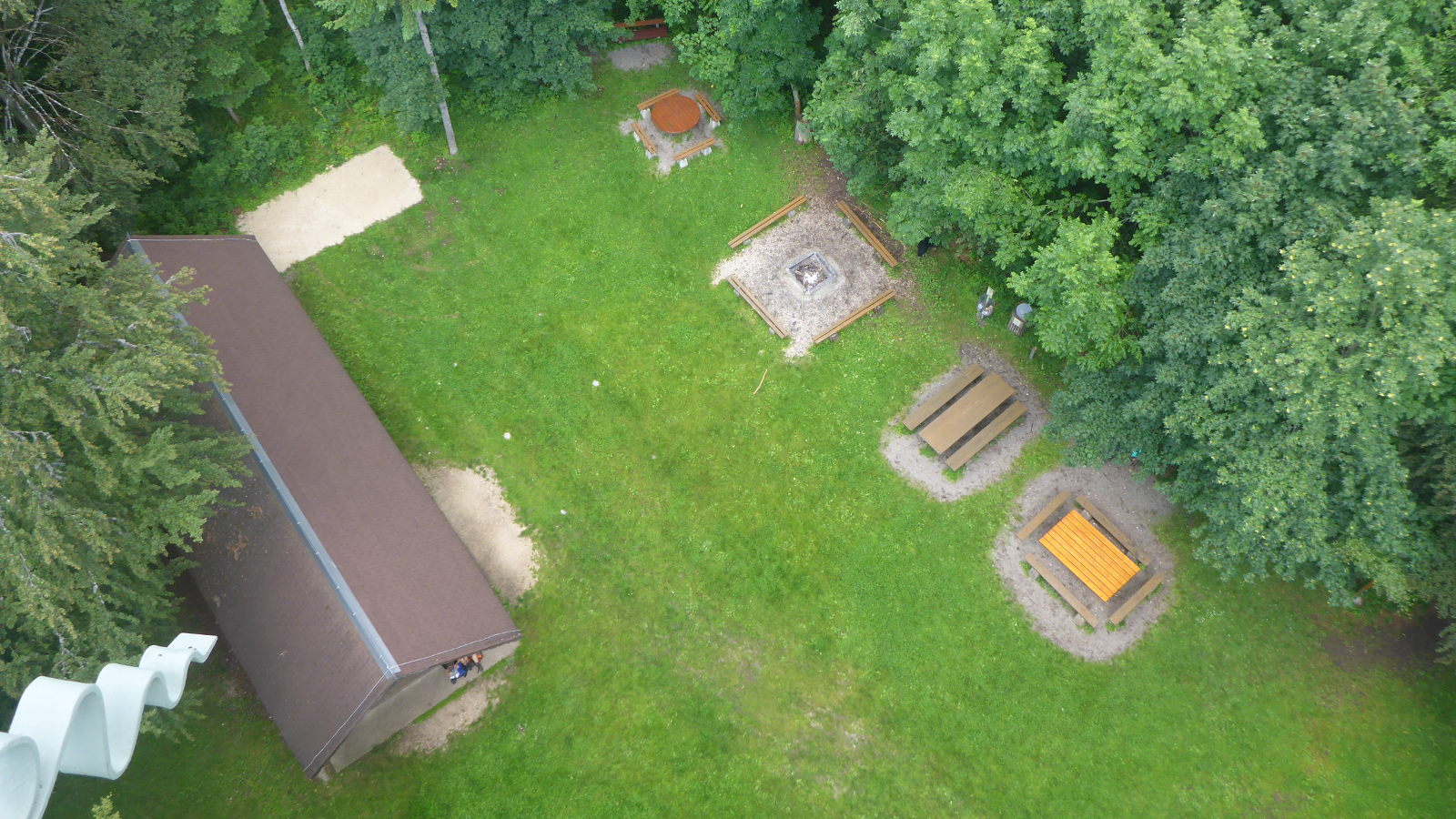 Mal ein anderer Blick vom Lembergturm bei Gosheim. Blick vom Turm nach unten auf die schön angelegte Grillstelle und Lemberghütte.