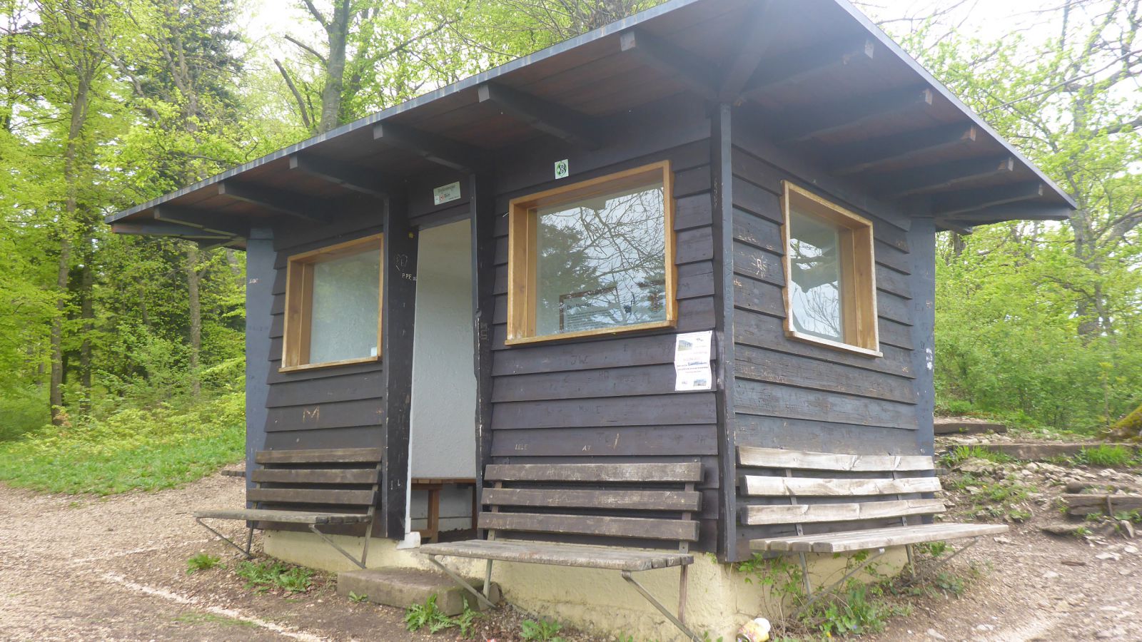 Die Schutzhütte am Dreifürstenstein. Glasfenster und schöne Holzbänke im Inneren. Der Betonboden momentan garniert mit leeren Flaschen, angebrannten Zeitungen und weiteren undefinierbaren Hinterlassenschaften der lieben Mitwanderer.