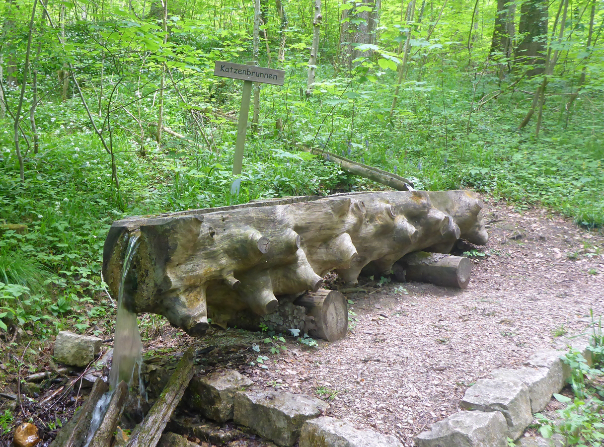 Wenn man am Aussichtspunkt Klippeneck weiter auf dem HW 1 geht, erreicht man am Ende des Flugfeldes am Waldrand eine schöne Grillstelle, an der vorbei der HW 1 und der Donau-Bergland-Weg in den Wald, Richtung Dreifaltigkeitsberg, weiterführt. An der Grillstelle steht ein Wegweiser, der mit einem grünen Wegweiser zum Katzenbrunnen (gelber Kreis) zeigt. Man geht rechts zwischen den Bäumen etwa 200 m den steinigen, dann steilen Weg nach untern und kann das begehrte Nass aufnehmen.