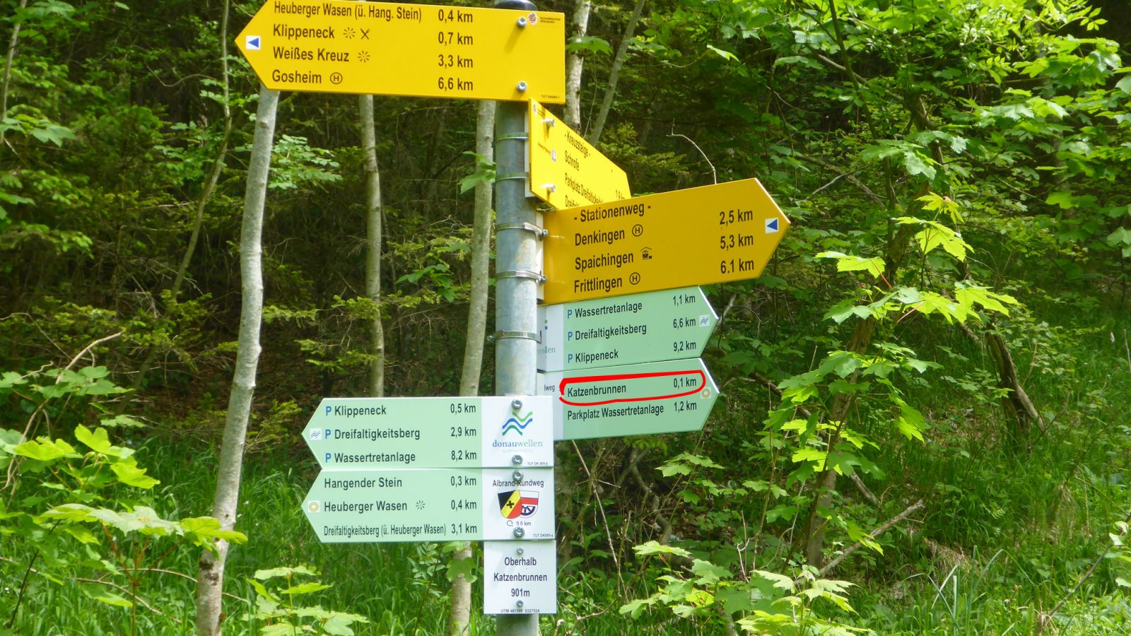 Der grüne Wegweiser mit dem gelben Kreis zeigt zum Katzenbrunnen.