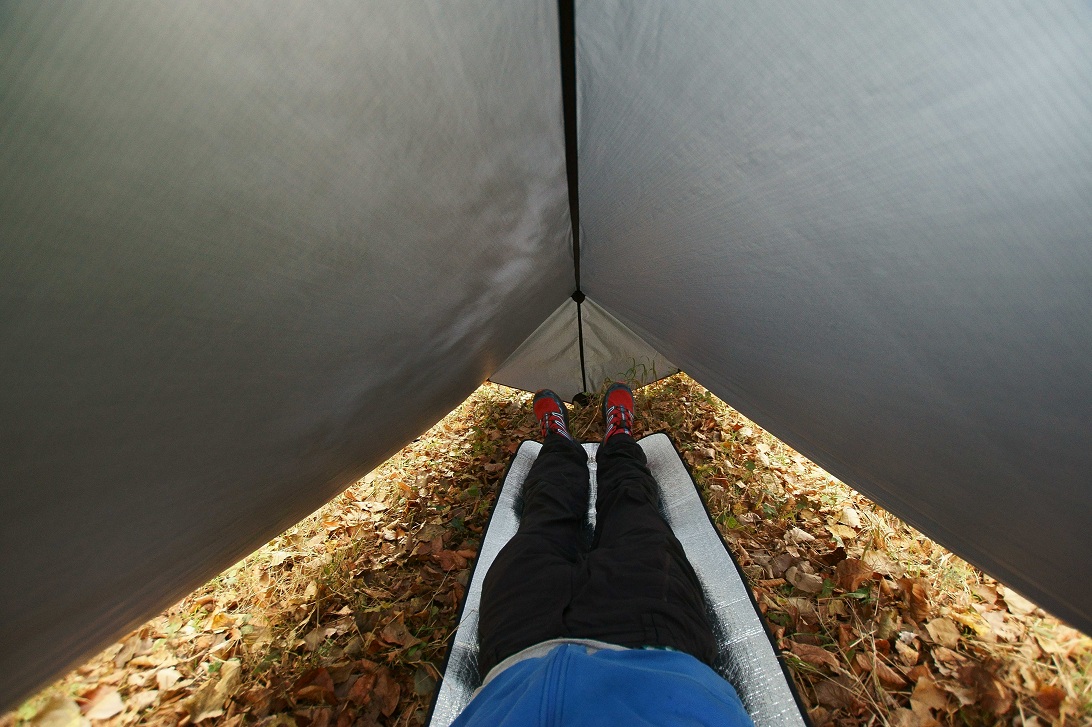 Tarp aus Gleitschirmnylon (37g/m²), Verstärkungen aus Zeltboden (90g/m²), 15mm Gurtband