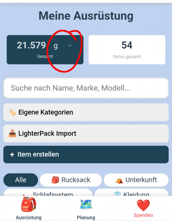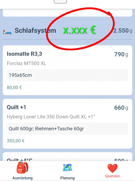 Hi maKSim, bin durch Zufall hier im Forum über Levity List gestolpert. Hab's ausprobiert und bin begeistert! Ein super Tool. Übersichtlich, schnell, durchdacht und einfach zu verstehen. Vielen Dank für die großartige Arbeit! Ich hatte einen guten Nachmittag Spaß, all mein Gear fein säuberlich aufzulisten (bzw von lighterpack zu importieren) und zu sortieren. Bei meiner ersten Packliste wäre ich am liebsten direkt losgezogen. Sehr motivierendes Tool also! Was mir auch besonders gefallen hat, war die Möglichkeit, die bezahlten Preise anzulegen, da mich immer schon interessiert hat, wie viel ich für den ganzen Spaß denn schon investiert habe. Hier deshalb auch mein Entwicklungsvorschlag, in der Hoffnung, den im Thread nicht schon überlesen zu haben: Könnte man neben dem Gesamtgewicht einer Kategorie auch den Gesamtpreis (das insgesamt investierte Geld) für diese Kategorie anzeigen? (siehe Screenshot) Und ganz oben beim Gesamtgewicht der Ausrüstung natürlich auch die ausgegebene Gesamtsumme. Zum Beispiel als Auswahl (g, kg, Euro, etc) im Feld Gesamtgewicht. (siehe Screenshot) Wäre das möglich? Außerdem möchte ich gerne einen weiteren Vorschlag unterstützen, der hier in thread schon genannt wurde: Auch ich habe schon eine Drag-and-Drop Möglichkeit zum Sortieren der Items vermisst. Bsp.: Ich habe drei Zelte für je eine bis drei Personen. Der Übersichtlichkeit halber würde ich diese gerne direkt untereinander setzen und der Personenanzahl entsprechend sortieren. Also Zelt 1P, Zelt 2P, Zelt 3P. Ginge ggf auch über Unterkategorien, aber auch dort hätte ich gerne die Möglichkeit meine eigene Reihenfolge anzulegen. Das wär's erstmal von meiner Seite aus. Vielen Dank nochmals für das Tool (Spende ist raus) und viel Energie für die Weiterentwicklung.2 Punkte -