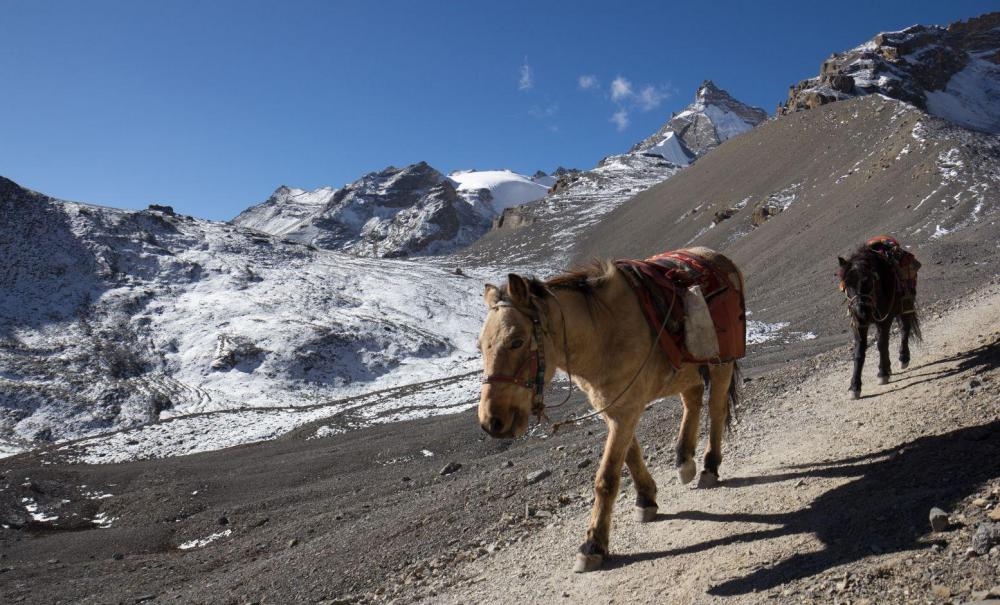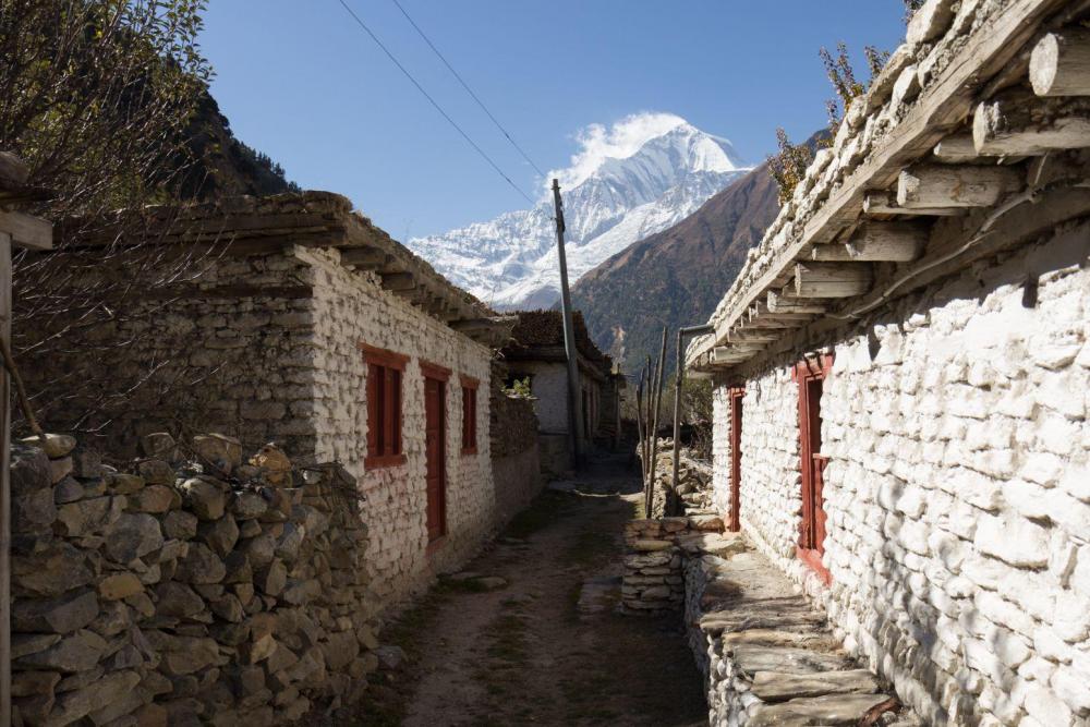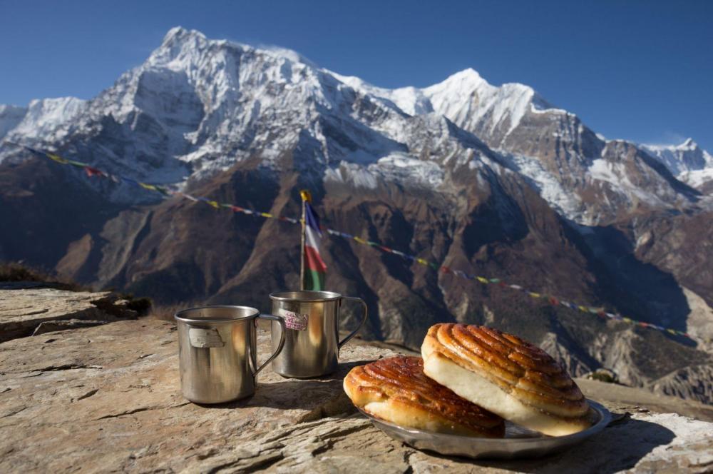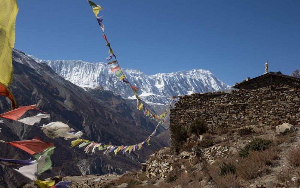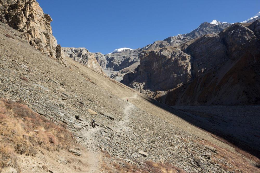 Bhrakag – Akklimatisierungstag, Sonne! So 5.11.17 Wir hatten gestern beschlossen heute zum Ice Lake zu wandern. Das ist ein Aufstieg von 1200Hm auf 4625m. Um 5:45 Uhr klingelt wie immer der Wecker und wir holen das vorbestellt Frühstück ab (2 Eier, 2 Chiapati-Fladen, und ein Franzbrötchen bzw. Cinnamon Roll) und los geht´s. Der Aufstiegt ist mühsam aber ich finde schnell mein (langsames) Tempo mit dem ich gut vorankomme. Felix ist schneller, macht aber immer wieder Fotopause, so dass wir uns immer wieder treffen. Nach 800 Hm kommen wir zum Teehaus, wo wir Milchkaffee trinken und unsere Franzbrötchen essen (Franzbrötchen werden üblicherweise auf 15 Hm gegessen und nicht auf 4250m!). Die restlichen 400Hm gehen besser als erwartet, was natürlich an den Franzbrötchen liegt ;-). Wir kommen zuerst an einem kleinen ausgetrockneten See vorbei, wo uns einige Leute mit Maultieren begegnen. Ein kurzes flaches Stück weiter liegt der grün schimmernde Ice Lake. Traumhaft schön umgeben von schneebedeckten Bergen. Ich beschließe zu baden, halte es aber nur wenige Sekunden in dem fast 0°C kalten Wasser aus. Leider klappt es mit den Fotos nicht so richtig. Auch die Fotos von Felix sind nicht wirklich gut, also gehen wir beide noch einmal in Wasser und machen bessere Aufnahmen. Danach reicht es erst einmal mit dem Baden und wir machen nach dem Mittagessen in der Sonne Siesta. Nach fast 4h am See auf 4625m machen wir uns auf den Rückweg, nicht ohne im Teehaus noch einmal Kaffeepause zu machen. Beim Abstieg sammeln wir bei knapp 4000m jeder ein Pfund Wacholderbeeren. Vielleicht lässt sich daraus ein besonderer Gin machen. Ich werde es versuchen. Um 17:00 Uhr sind wir wieder im Hotel, 30 min bevor es dunkel wird. Ein wahnsinnig schöner Tag geht mit einem sehr reichhaltigen Abendessen zu Ende. Bhrakag – Khangsar – Yak Kharka – wolkenlos, Sonne pur! Mo 6.11.17 Heute wollen wir einen kleinen Abstecher nach Khangsar machen und die Big Wall ansehen. Ich wache nach den 1200 Hm gestern erstaunlich fit auf. Los geht´s – aber vorher kaufen wir noch Proviant für heute aber auch für den Pass ein. Außerdem finde ich für 6€ noch eine Fleecehose. Die Passform ist zwar eher schlecht, aber ich werde mich über den zusätzlichen Wärmegewinn noch freuen, weil es in den Restaurants beim Abendessen in der Regel eisig kalt ist. In Manang trinken wir einen Lavazza Latte Macchiato – purer Luxus! Danach geht es weiter nach Khangsar, wo wir die mitgebrachten Apfelteilchen und Schokocroissants zum Frühstück essen. Gut gestärkt geht es ein gutes Stück hoch nach Middle Khangsar und weiter nach Upper Khangsar. Upper Khangsar wirkt wie eine verlassene Ruinenstadt – echt sehenswert! Man steigt ca. 400 Hm bis hierher auf und folgt dann flach den Berghang weiter bis man wieder ins Flusstal absteigt. Den Fluss überquert man wie üblich auf einer Hängebrücke. Kurz danach triff man wieder auf den Annapurna Circuit. Das Stück nach Yak Kharka ist ziemlich flach. Bin nach dem langen Tag doch ziemlich müde und ich freue mich über eine heiße Dusche, ein leckeres Abendessen und gehe heute sehr früh schlafen. Yak Kharka – Thourong Phedi – Sonne pur! Di 7.11.17 Habe einigermaßen gut geschlafen, mir war mit der Fleecehose fast ein wenig zu warm. Das Ding ist Gold wert! Wir schaffen den Aufstieg nach Thourong Phedi in 2h 15min und bekommen noch ein super Zimmer mit eigener Toilette. Leute, die nur 30-45min später ankommen müssen bei den Zimmern schon Kompromisse machen. Nach dem wir das Zimmer bezogen haben, gibt es ein sehr sättigendes Frühstück (Potatoe Omlett und ein riesiges Brötchen) sowie meinen mitgebrachten Kaffee und Milchpulver. Ansonsten ist heute nur faulenzen angesagt. Man merkt bei den Leuten eine leichte Nervosität, da dies die letzte Nacht vor der Schlüsseletappe Thourong La Pass ist. Nachts wache ich leider wieder kurz mit Atemnot auf, ansonsten habe ich mit der Höhe keine Probleme.1 Punkt
