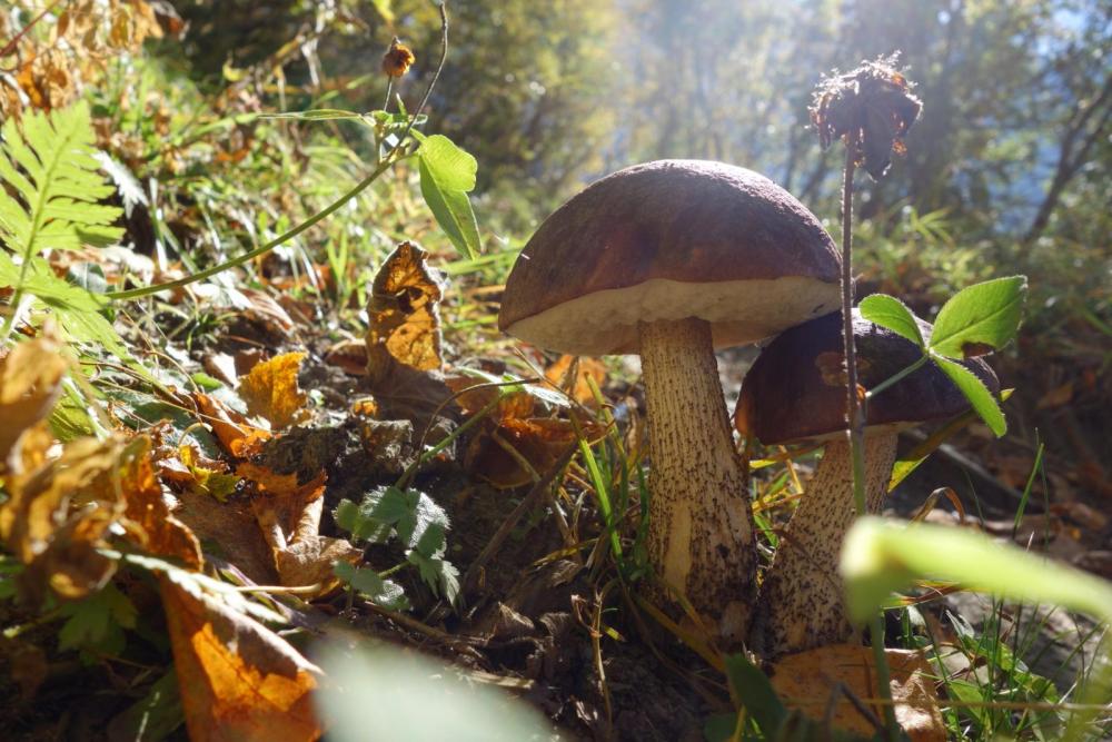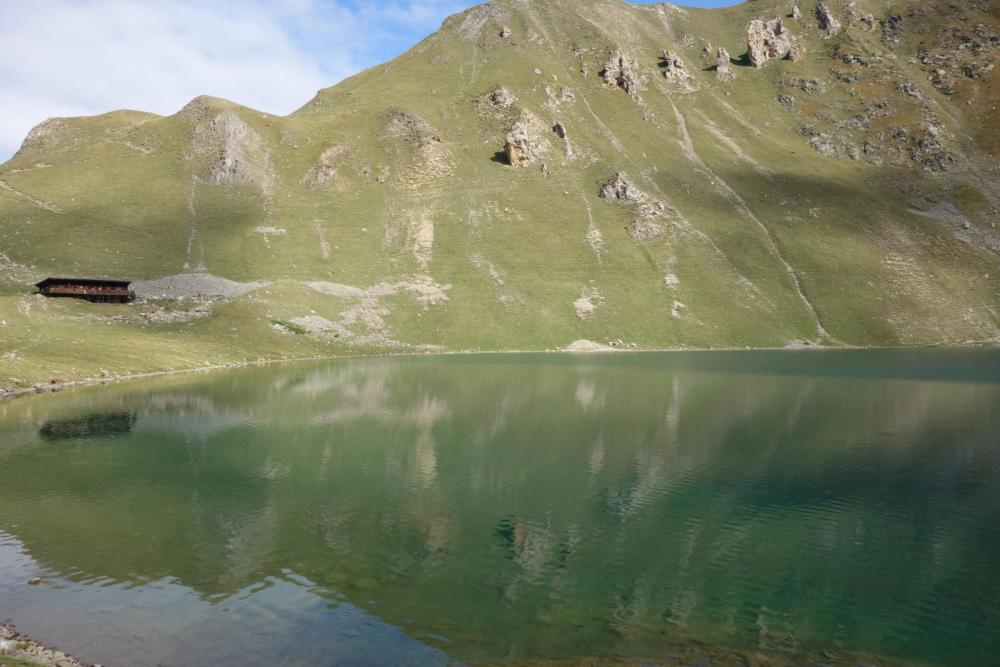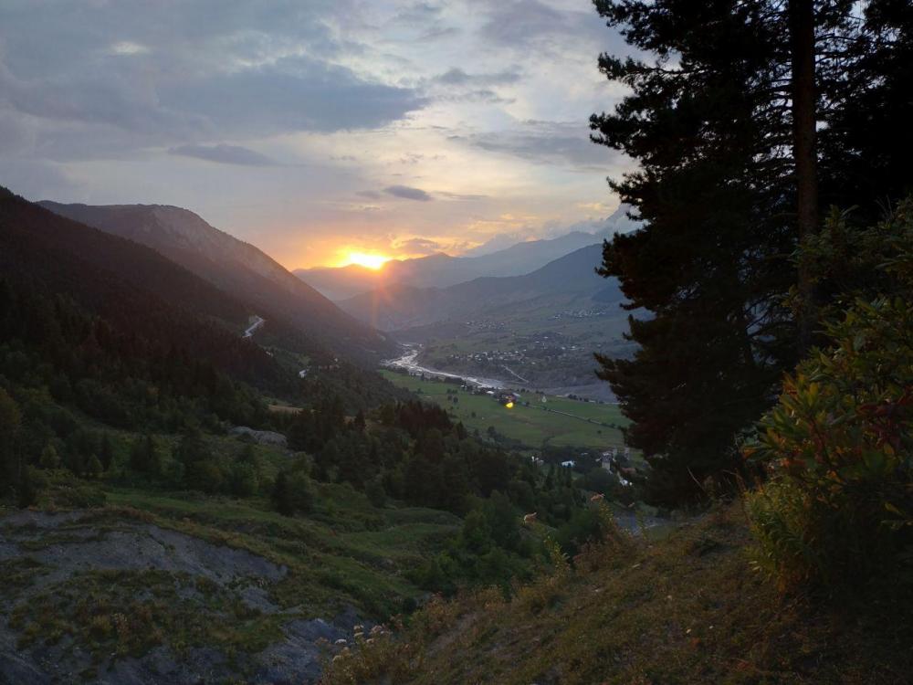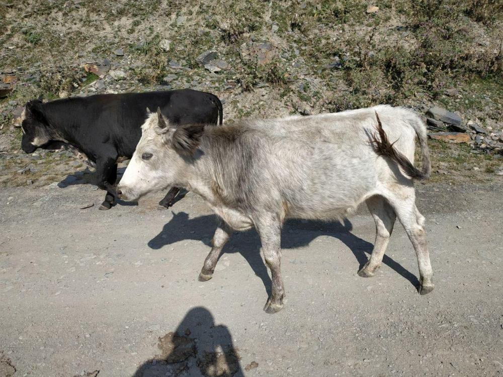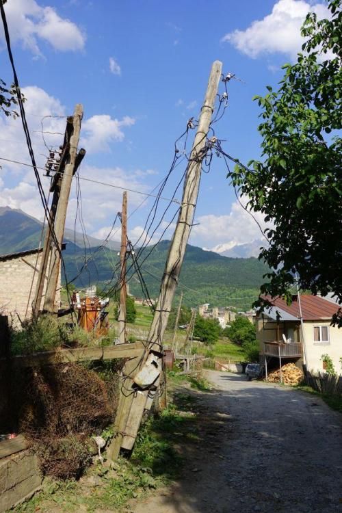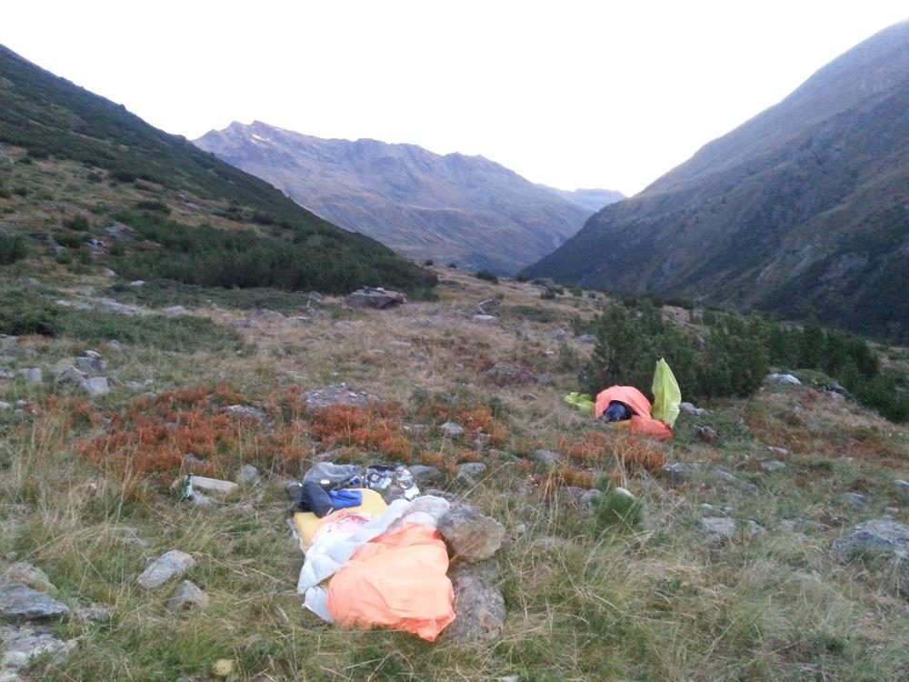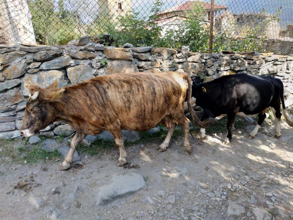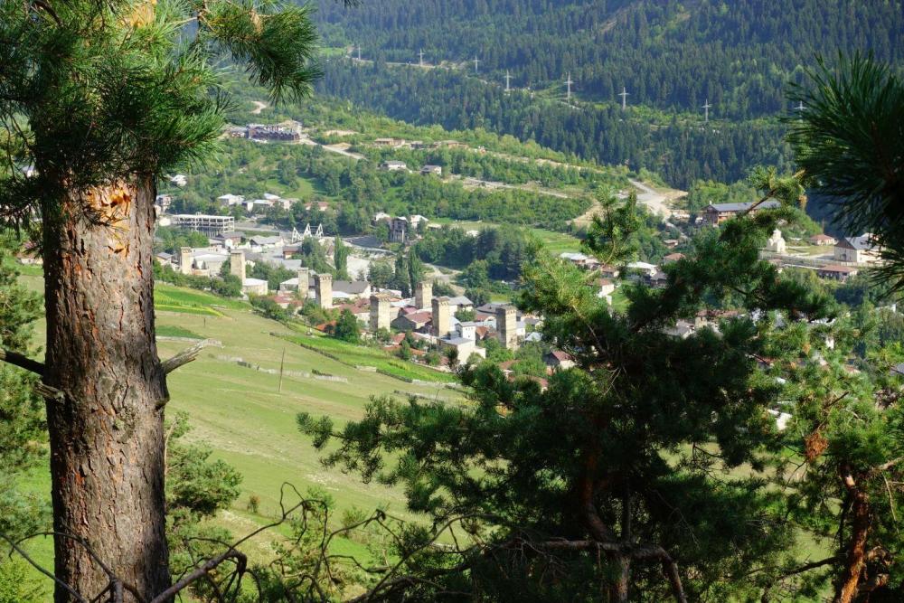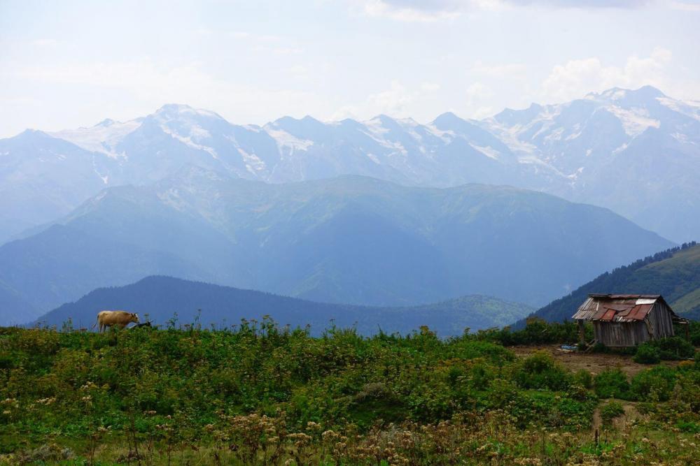 Also zurück und seitlich runter zum Abstieg nach Lakhiri. Es ist steil, größtenteils weglos, teilweise über alte, kaum noch erkennbare trails. Der Grat teilt sich mehrmals, ohne den GPS Track wäre ich nicht nur ein Mal sonstwo gelandet. Die Füße leiden abermals, rutschen in den Schuhen auf bereits seit ein paar Tagen nicht mehr wirklich angenehme Sohlenstellen. Die Wiese ist in voller Blüte - und alles möchte in meine Schuhe und mitgetragen werden. Dafür gibt es Blaubeeren ohne Ende. Am Auslauf des Grats wird es waldiger, erste Blicke auf Lakhiri ergeben sich. Nach insgesamt 7h bin ich in Lakhiri. Was für ein Kontrast zu Mestia. Ein gottvergessenes Dorf, nur wenige Meter von der Wanderautobahn zwischen Mestia und Ushguli. Zahlreiche Türme, null Touristen, nur alte, gebückte Muttchen. Habe ich eigentlich schon von den ungewohnt anzuschauenden Kühen berichtet? Da wird einem erst mal klar, mit was für eindimensionalen Züchtungen wir es zu tun haben. Tiger gefällig? Oder lieber grau und zottelig? Für jeden was dabei! Dann treffe ich auch schon auf besagte Wanderautobahn im Tal. Jedes Haus ein Guesthouse, Bars, Shops. In den Vorgärten erholen sich die Teilzeitwanderer von den Flachlandstrapazen des Vormittags. Ich mache nur kurz Pause an einem Dorfbrunnen zum Wasser auffüllen und ziehe mir in der Bar daneben die nächsten spannenden Geschmacksrichtungen der Ostblocklimo, dann mache ich weiter. Bisheriger Favorit: Birne! Immer wieder quatscht mich jemand voll, gerne auch nicht mehr ganz zurechnungsfähig: Wasser kaufen, hier schlafen, da Essen, dort Taxi - neee, madloba. Bedenklich, wie gewandelt die Leute hier sind. Von freudigem winken und irgendwie kommunizieren und etwas erfahren wollen weiter im Westen zu anstrengenden und auch noch schlechten Salesversuchen hier in der Gegend. Ich laufe schon wieder eine halbe Ewigkeit auf der ekelhaft staubigen aber optisch mit betürmten Dörfern durchaus hübschen Strecke im Tal, da trabt auf ein Mal der Köter wieder neben mir, guckt hoch, grinst wieder - als wäre nichts gewesen. OK, jetzt bin ich echt baff. Mich auf dem Grat wiederzufinden, OK. Aber Nach Stunden über den weglosen Seitengrat sightseeing aka Türme anschauen kreuz und quer durch's Dorf und dann noch mal ein paar Stunden im Tal? Abgefahren, was für ein Stalker! Nun läuft er wieder vor und hinter mir, als wäre er nicht weg gewesen, komisches Tier! In den Dörfern kläffen andere Hunde den Fremdling auf vier Beinen an, laufen ihm nach, er interessiert sich nicht groß für sie. Ich peile langsam an, ein Nachtlager zu suchen. Es zieht sich etwas zu, der Regen, der für Nachmittag angesagt war, wird wohl am Abend kommen. Wie sich der Köter das wohl vorstellt? Ich - oder besser wir laufen durch Chvabiani langsam wieder bergauf, weg von der Autobahn, ich ziele auf ein Fleckchen größerer Kiefern auf einem Hügel, die Hängepotential haben dürften. Da kommt uns ein Minivan entgegen - das bekannte, neuere, asiatische Fabrikat, rechtsgelenkt, verstrahlt? Der Van hält, der auch nicht mehr ganz klare Beifahrer quatscht mich an. Ich erwarte den nächsten Sales pitch. Da geht die Schiebetür auf, Einsatz millennial Mädel: "Du ju spiek inglischhh? Hav Ju siehn tzree tschörmanz?" Ich bin von der Brilianz der Frage fast sprachlos: "Do they carry a flag? This area is full of Germans!" "No, wis a gitar on zhe back" "No girl, wrong film, sorry." Ich gehe weiter. Der Van rollt den Hügel hinunter, ich sehe ihn noch am nächsten Guesthouse stoppen und höre sie Namen rufen. Der Köter fand den Van wohl spannender als mich, jedenfalls trabt er lieber ihm in die entgegengesetzte Richtung hinterher. Komisches Tier, es sollte unsere letzte Begegnung sein. Herje, ganz Georgien ist ein deutscher Teenie Selbstfindungstrip! Ganz Gallien Georgien? Nein. Ganz einfach höher steigen. Dahin, wo sich das Verhältnis Schweiß zu Instastory Likes der 24/7 Foto- und Videodokumentation des grandiosen Abenteuers nicht mehr rechnet. Da ist man ganz schnell allein - und zwar völlig. Der Fleck Kiefern passt, Blick auf das Tal in Abendsonne ist auch vorhanden. Ich baue den Tarpbunker auf und wappne mich für Regen und mehr. Dann kochen, etwas Körperpflege, es dunkelt - und tröpfelt auch schon just im Moment, in dem ich mattenfertig bin. Also ab unters Tarp, dem Unwetter lauschen. Ein paar Mal blitzt und donnert es recht unmittelbar und auch später weiter weg sind die Blitze in der Dunkelheit und die Donner in der Stille nicht zu ignorieren. Zu Anfang bin ich noch etwas besorgt, ob auch alles hält, kräftige Böen Drücken und zerren hier und da. Doch es macht alles einen passablen Eindruck und so halte ich noch die Gedanken des Tages fest, sehe mir die nächsten Tage an und schlafe relativ früh. Nachts werde ich immer mal von Böen wach, es hat aufgehört zu regnen - ich beschließe, der Eigenkonstruktion zu trauen und freue mich, dass das Tarp gleich wieder trocken gepustet wird und nickere immer wieder direkt weg.1 Punkt -