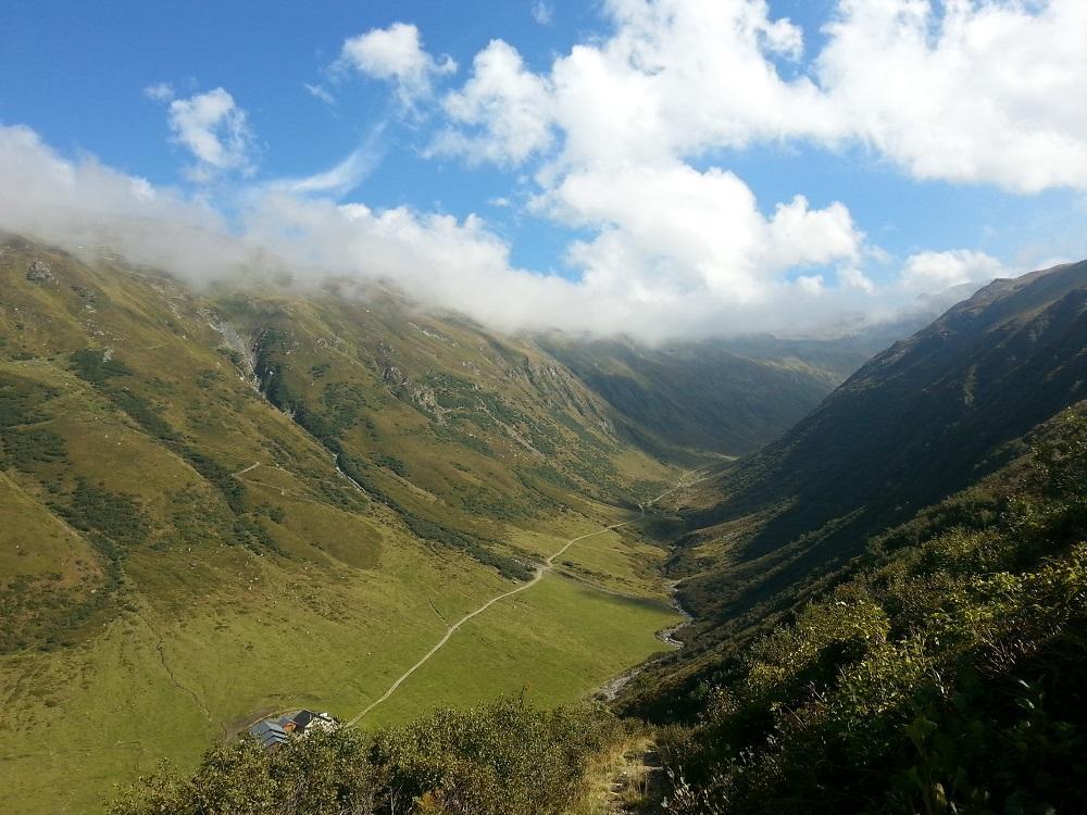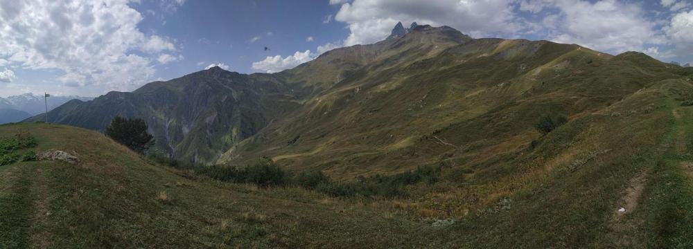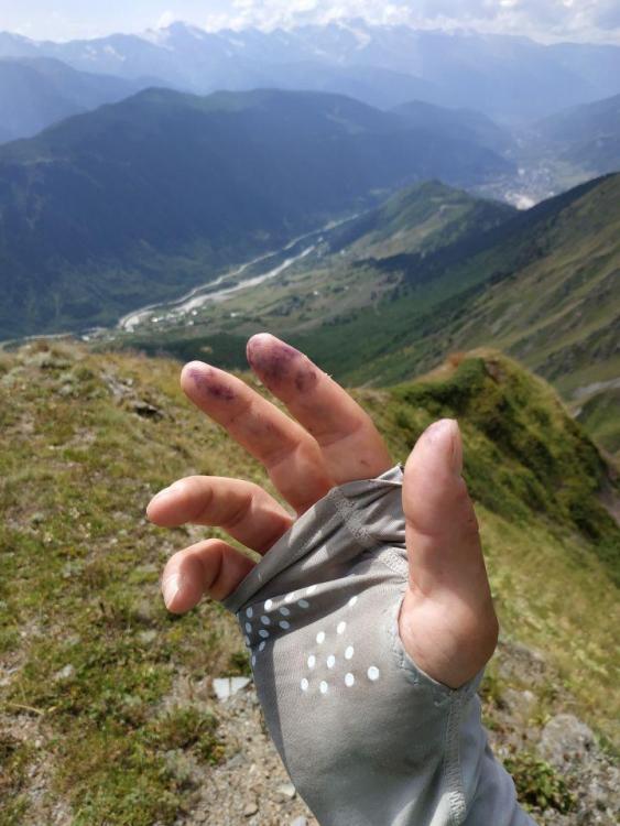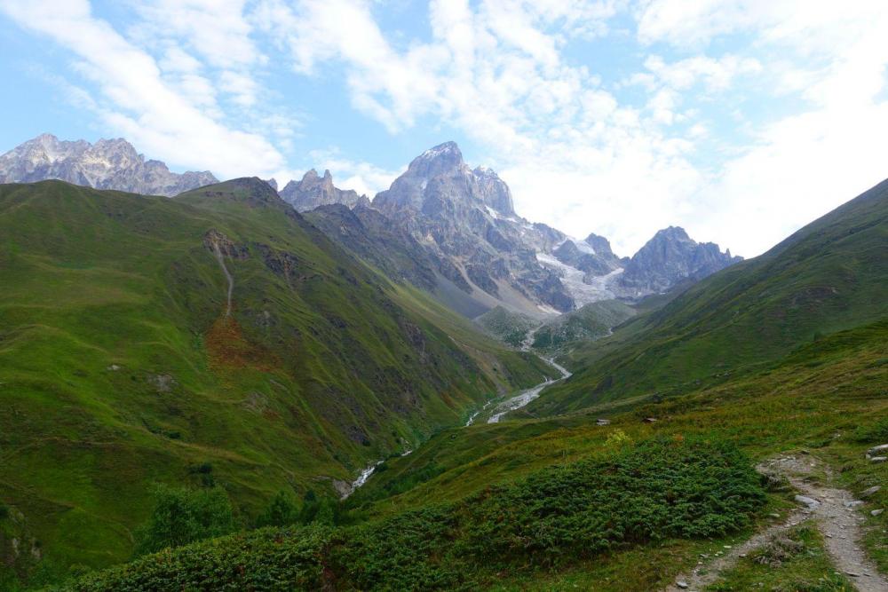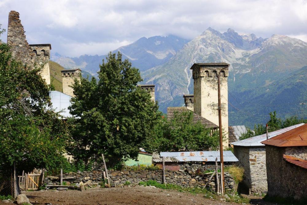 Tag 8: "Ohne Regen in die Traufe" Eckpunkte Guli -> Guli Pass -> mestia -> Ruine hinter Mestia 21km, 1380hm up, 1685hm down, höchster Punkt 2933m Die Aufwachmanöver starten gegen 6. Da kann ich kann die Slowaken schon beim Packen und Schnacken hören. Ich genieße noch etwas die Hängematte, gegen halb 7 gewinnt das schlechte Gewissen und ich stehe endlich auf. Das Übliche, packen, Wasser filtern. Das Unübliche: Musli löffeln. Dann geht es kurz nach 8 los. Da sind die Slowaken schon eine Weile unterwegs. Sie wollten an den koruldi lakes zelten, der Spot wird überall empfohlen, mangels Stöcken und der eher windigen Nacht am toba lake werde ich aber wohl eh weiter absteigen müssen, laufe aber anscheinend eh deutlich längere Tage als sie. Die Dresdner vor ein paar Tagen hatten mir ein eco guesthouse hinter Mestia empfohlen, dass nach dem Resupply eine Option wäre. Für den folgenden Tag war die Woche über Regen angesagt, ich bin mir noch immer nicht sicher, wie tief die Wunde am Schienbein eigentlich ist und ob da nicht doch noch mehr Stein rausgeholt werden muss und überlege, in Mestia einen Pausentag einzulegen und einen Arzt aufzusuchen. Auch heute ist tagsüber ist leichter Regen möglich sagt der Wetterbericht, dafür sieht morgen schon wieder etwas besser aus - davon war gestern Abend noch nichts zu lesen, na mal schauen. Die Sonne ist noch hinter dem Pass, leichte Wolken, äußerst angenehme Bedingungen, um Höhenmeter zu machen. Der Weg ist zumeist für erkennbar und so verbringe ich die Zeit beim Serpentinen schinden mit dem memoartigen Festhalten des gestrigen Tages auf dem Smartphone. (An dieser Stelle bin ich bereits kurz unterhalb des passes, die Zeit vergeht super beim Schreiben :)) Unten ist Mazeri und Guli zu sehen - immer wieder rewarding, so ein Blick in die Richtung, wo man herkommt. Noch immer beäugt mich der Ushba, diesmal von der Rückseite, noch immer bekommt er den Mittelfinger, aber ich trolle mich ja, gebe mich eindeutig geschlagen! Der letzte Anstieg ist noch mal Steiler, der Weg teilt sich in zahlreiche kleine mal bessere, mal schlechtere Wahloptionen vorausgegangener Wanderer. Es geht auf fast 2900m die Ohren knacken. Dann ist der Guli Pass geschafft. Hinter dem Pass sind die Slowaken am Pausieren, sichtlich geschafft, aber ich staune, wie tough sich vor allem die zierlichen Mädels mit ihren mächtigen Rucksäcken schlagen. Es geht ein Stück weit auf einem Grat weiter, tolle Ausblicke in alle Richtungen, wenn auch etwas wolkig in der Ferne. Danach geht es langsam, aber stetig bergab, schöne Blicke in's Tal inklusive, ansonsten relativ ereignislos bis auf ein paar Rinsaale, die tatsächlich noch Eisschicht tragen. Ich schließe zu zwei Tschechen auf, wirklich nette Typen, wir laufen eine Weile zusammen, plaudern - angenehm, mal etwas mehr Austausch über das Hände-und-Füße mit den Einheimischen und den Smaltalk mit den meisten anderen Wanderern hinaus. Eine erste Hütte kündigt an, dass die Zivilisation nicht mehr allzu weit sein kann. Wir kommen parlierend über eine Anhöhe, da trifft es uns plötzlich wie ein Schlag. Wir stehen inmitten einem Zirkus aus Autos, Trauben an Tagestouristen, Paraglidern, Aussichtsplattform, volles Programm. Während der Weg bis hier aus Mazeri ein schmaler Pfad in völliger Natur ist, frisst sich aus Mestia eine dirt road Richtung der Koruldi lakes, was für ein Zivilisationsschock! Mein Bedarf, die Koruldi Lakes zu sehen oder gar dort zu nächtigen sinkt gen null - oder gar in den negativen Bereich. Wir rasten kurz, sehen uns das Spektakel der Paraglider an, die mit Touristen gen Tal starten. Da kommt ein Deutscher Millennial ohne T-Shirt und wohlgebräunt mit einem wahrlich ernsten first world problem auf uns zu mit Akzent, der dem Gehörgang geradezu physische Schmerzen zufügt. Er braucht ganz, ganz dringend Sonnencreme, damit er sich keinen Sonnenbrand zufügt. Hat doch seine Freundin die Sonnencreme mit nach unten genommen, als sie nach diesem hoch strapaziösen Anstieg mit dem Taxi nach unten gefahren ist Drama! Ich sitze mit dem Rücken zu Ihm, hadere mit einer Antwort, um mich nicht als Tschörman buddy zu outen und auch noch Smaltalk halten zu müssen. Die Tschechen sind einfach zu nett und hilfsbereit, irgendwo im relativ großen Rucksack muss die Sonnencreme sein. Unser Sonnenbrandgefährdeter Freund wartet seelenruhig minutenlang, wie der Tscheche seinen ganzen Rucksack nach der Sonnencreme umgräbt, um sie sich aushändigen zu lassen. Er cremt sich genüsslich und mehr als reichlich ein, macht ja nichts, dass der Besitzer damit vielleicht noch Tage unterwegs sein wollte. Bedankt sich knapp, verschwindet. Wir sind kurz davor, unsere Verstörtheit Auszutauschen, da kommt er tatsächlich noch mal zurück - denn: Er hat das Gesicht vergessen - herrje! Schon wieder ein Drama in der beängstigend kleinen Egowelt. Er lässt sich also ernsthaft noch mal die Creme herausgraben, um dann endlich und endgültig zu verschwinden. OH-MY-GOD, da bin ich ja schon auf Mestia, das größte Touristenmolloch der Gegend gespannt. Die Tschechen haben einen alternativen Pfad zur Dirt Road gen Mestia entdeckt, er entpuppt sich jedoch nach einer ganzen Weile als einzige steinig-sandig-staubige Rutschpartie. Die Schuhe voll Sand geht es meist an zum Glück fest verwurzelten Bäumchen und Ästen greifend und der Steile halber eher rückwärts bergab. Den Beiden ist das Ganze irgendwann nicht mehr geheuer, sie entscheiden sich, wieder zurück aufzusteigen und doch die Dirt Road zu nehmen, da sind wir schon fast auf der Hälfte. Ich bin zu faul, also weiter bergab. Wie fängt man Steigung im Bild ein? Gelungen ist mir das auch diesmal nicht. Weiter unten werde ich mit einem Schönen Panorama auf Mestia belohnt - denn zumindest optisch hat das Städtchen durch die Türme schon etwas zu bieten. Der weg ist langsam wieder als Weg zu bezeichnen, flacher, etwas ausgebaut, da kommen mir ein Paar eher in nordic walking Anmutung und ho