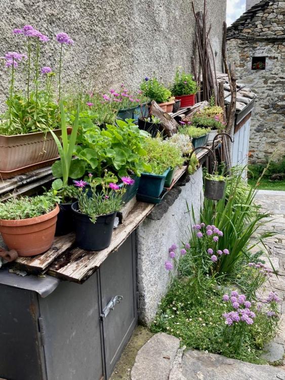 Freitag 30.07.2021 Anreise nach Domodossola Zur Anreise gibts nicht viel zu sagen, gute 12 Stunden bin ich samt Umsteigezeit mit der Bahn unterwegs. Bei Ankunft in Domodossola ist es sehr schwül. Ich geh noch etwas essen und falle in einen tiefen Schlaf. Domodossola am ersten Abend Samstag 31.07.2021: Graniga - Rifugio Il Dosso (670 hoch / 10 runter) Sanftes Ankommen Nach dem Aufstehen weiß ich nicht, ob ich lachen oder weinen soll: Ich habe tatsächlich mein zweites Paar Socken vergessen. OH NO! Wie kann das denn sein? Aber ich versuch es mit Humor zu nehmen. Erstunken ist noch niemand. Und vielleicht gibts irgendwo zumindest die Möglichkeit IRGENDWELCHE "Söckchen" zu kaufen. Dann könnte ich am Abend was an den Füßen haben, während die Wandersocken sich regenerieren und nach einer Waschaktion wieder einsatzfähig werden. Insgeheim verspüre ich aber auch einen gewissen Ehrgeiz, ob ich es nicht schaffen könnte, mit einem Paar auszukommen und sie dennoch, wenn nötig, zu waschen. Zum richtigen Zeitpunkt, am richtigen Ort. Hmmm... Außerdem gleichen die eingesparten 60g die übertriebene Anzahl an Ersatzbatterien für das Garmin aus. Let's see. Um 11 Uhr 30 will ich (nach einem für italienische Verhältnisse üppigen Frühstück) den Bus in die Berge nehmen. Die ersten zwei Tage sind zum Eingewöhnen. Eigentlich wollte ich die erste Nacht draußen schlafen, aber es hat sich fast zu einem Selbstläufer entwickelt: für die erste Nacht ist irgendwie immer Gewitter angesagt, diesmal sogar Unwetter-Warnung. Also doch Rifugio. Auf dem Weg zur Bushaltestelle sehe ich ein paar Wanderstiefel bei einem Mülleimer stehen und denke noch schmunzelnd, will da wohl jemand auf leichtere Sneaker umsteigen? Zu dem Zeitpunkt wusste ich noch nicht, dass mich das Thema Schuhe noch einmal selbst ereilen würde... Was war hier denn los? Ich wollte bis San Lorenzo, der vermutete Endstation fahren. Der freundliche Busfahrer will mich jedoch unbedingt noch bis zum nächsten Weiler bringen. Ich bin erst nicht so überzeugt, denn ich will ja keine Busreise machen. Aber ein Blick auf die Karte verrät mir, dass ich mir doch etwas Straße sparen könnte und so beschließe ich, dass ich das Angebot annehme und für die eingesparte Strecke lieber ein wenig durch den hübschen Graniga spaziere. Ziemlich aufgeregt genieße ich wieder einmal die Busfahrt. Bis auf die ersten 10 min, in denen eine Italienerin im Bus sitzt, ist der Bus leer. Das Herz geht mir auf, angesichts der bevorstehenden Tage und der Landschaft um mich herum. Spaziergang durch das schmucke Graniga Hübsche Pflänzchen überall Ich habe etwas Mühe den Einstieg in meine Etappe zu finden, aber eine Frau schickt mich auf den Weg. Dieser ist zwar nicht auf meiner Karte, aber der Wegweiser ist mit einem Ortsnamen beschriftet, den ich auf derselben finden kann und ich gehe in die richtige Richtung: bergauf. Ich merke schnell, dass das innere System noch auf Hochtouren läuft. Draußen friedliche Natur, ich rieche den feuchten Wald und das frisch gemähtem Gras, drinnen wilde Gedankenstrudel. Die Synchronisation mit dem Kosmos ist wohl noch nicht abgeschlossen, wie ein werter Kollege vermutlich sagen würde. Ich komme relativ früh, noch vor dem ersten Regen am Rifugio Il Dosso an. Es liegt etwas oberhalb der Etappe Gattascosa - Laghetto. Morgen muss ich zwar auf dem gleichen Weg ein Stück zurück, aber das Rifugio soll etwas netter sein, als San Bernardo, welches direkt am Weg liegt. Und ich habe ja nur ne halbe Etappe. Erstes Rifugio: Il Dosso Im Rifugio scheine ich der einzige Gast zu sein, abgesehen von einem italienischen Pärchen, welches viel mit den Gastgebern zu Gange ist. Am Nachmittag drücke ich mich etwas rum, es ist frisch geworden, regnet immer mal wieder etwas, aber ich finde ein überdachtes Plätzchen, höre Musik und schreibe meine ersten Eindrücke auf. Ich muss mich an das nichts-zu-tun-haben gewöhnen. Es ist aber auch gut, einfach mal mit ein paar ruhigen Takten auf den Ohren auf einen wolkenverhangenen, mitunter dunklen Himmel zu gucken, Regen und bewaldete Berge um mich herum. Mit Grollen macht ein versprochenes Wetter auf sich aufmerksam. Ich werde ein wenig emotional. Relax. Gegen Abend gebe ich mir einen Ruck und setze mich zu den italienischen Leuten in die Stube. Ich bestelle mir einen Sprizz zur Zungen-Lockerung und tausche meine Hemmungen gegen die eingerosteten Italienisch-Kenntnisse. Es stellt sich heraus, dass die Gäste Verwandte von dem Paar sind, die die Hütte bewirtschaften. Sie sind übers Wochenende zu Besuch. Es folgt ein nettes Plaudern mit den sympathischen Leuten und ich bekomme stolz jede Menge Fotos von riesigen, selbst gefangenen Forellen von Vater und Sohn gezeigt. Kurz vor dem Abendessen kommt dann doch noch ein Schweizer Paar, die auch auf der GTA (mit Varianten) unterwegs sind. Es wird noch ein geselliger Abend und die Wirtsleute erzählen uns unter anderem Historisches zu den umliegenden Pässen.1 Punkt