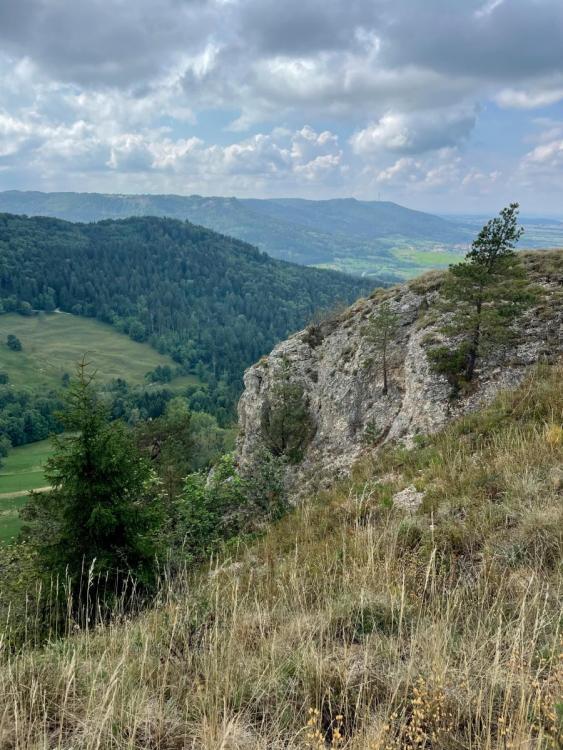 Tag 12: 28. August, 26km, 820 HM, nördlich von Onstmettingen (Zollersteighof) bis südlich von Balingen (kurz vor dem Lochenstein) Heute geht es also wieder mit Hund weiter und gleich wieder in den Wald. Es ist neblig-wolkig, ein bisschen so wie gestern und so sehe ich den Fotograf mitten im Wald recht spät. Erst wundere ich mich, was er hier tut (mal außerdem Offensichtlichen: Fotografieren) und dann entdecke ich die Burg Hohenzollern. Mein Bild ist sicherlich nicht so gut wie seines: Während ich weitergehe, höre ich immer mal wieder Fetzen von Musik durch die morgendliche Luft schweben. Es dauert eine Weile, bis ich sie richtig höre und einordne. Und dann stehe ich tatsächlich auf dem Heiligenkopf und höre ein (oder mehreren) Alphörnern zu, die eine einfache Melodie in F-Dur spielen. Ich halte inne und höre einfach nur zu. Durch den Wald geht es dann bis zu einem Parkplatz, der direkt am Gasthaus Stich liegt. Das ist meine erste 5-km-Marke für heute, aber das Wirtshaus hat noch nicht auf. Draußen auf einer Bank mache ich Rast, trinke etwas. Die nächsten 5 km sind unspektakulär, bis auf eine Herde Schafe, die sich auf den Weg und die Wiese nebendran ergießt. Sie sind ziemlich cool, denn meine Hündin beeindruckt sie nicht im Mindesten. Gut, die jagt auch nicht (Erziehung) und vielleicht spüren die das. Ich glaub, ich hab noch gar nicht beschrieben, dass ich immer in so 5km Abschnitten laufe, um meinen Wandertag zu strukturieren, oder? Es macht es manchmal einfacher, wenn man nicht ständig stehen bleibt! Bis zu Kilometer 10 hat es auch ne Menge Asphalt und ich höre mal wieder Podcast. Als ich Pause mache - bei Pfeffingen - geht im Dorf ein Fest mit Blaskapelle los. Nicht mein Ding, aber nach dem ganzen Corona freu ich mich für die Leute hier. Nachdem wir getrunken haben, geht es hoch auf den Böllat. Ein Berg mit Wiesenkuppe wie ich ihn liebe. Von hier oben sehe ich den gesamten Weg des Tages - bis vor den Fernmeldeturm - aber kann es nicht so recht glauben. Es ist soso viel! Aber leider ist es genau so: Vom Böllat läuft man nach Burgfelden runter (wo es eine nett aussehende Wirtschaft gibt) und plötzlich stehe ich an einer Ecke, wo ich schonmal war: letztes Jahr bin ich hier mit meiner Tochter alpine Pfade gelaufen! Da hatten wir schon das Zeichen vom HW1 gesehen und ich hab gesagt: den lauf ich mal! Tja! Es fühlt sich gut an, seine Träume zu verwirklichen - auch wenn ich's mir anderes erträumt hatte. Das ist immer noch tausendmal besser als immer nur zu träumen. An der Ruine Schalksburg mache ich Rast und bin in Gedanken im letzten Jahr. Ich esse die letzte Portion der getrockneten Bohnenpaste mit Maischips (boah, das ist dermaßen gut!) und steig dann ab nach Laufen. Ich checke kurz die Busse nach Balingen - dort werde ich heute Nacht in einem Hotel pennen, da ja mein Zelt inzwischen daheim ist. Ich will nicht allzu spät ankommen und beschließe, ab jetzt Meile zu machen. Aber es gibt eh nix zu sehen: kilometerlang geht es Schotter entlang und der Hund trottet hechelnd hinter mir her. Erst als es durch den Bannwald steil nach oben geht ist sie wieder vor mir. Jetzt bin ich es, die hechelnd hinterher trottet. Das Hörnle ist nach dem Böllat noch ein Highlight! Grandiose Sicht und irgendwie ein Berg mit Charakter. Völlig erschöpft mache ich Pause, trinke in großen Schlucken und lasse mich vom Wind kühlen. Durch das hohe Tempo können wir uns das erlauben und erwischen trotzdem noch den Bus. Vom Pass geht es ruckzuck nach Balingen, wo ich in einem Hotel am Bahnhof unterkomme. Alle Räume sind individuell eingerichtet und der Chef (?) ist der Traum aller Wanderer: er wäscht meine Wäsche mit! Er hat auch wahnsinnig viel zu erzählen und sich zu vielen gesellschaftlichen Themen Gedanken gemacht. Wäre ich nicht so müde gewesen, hätte ich sicher noch viel länger mit ihm gequatscht. PS: noch ein Blick vom Böllat2 Punkte -