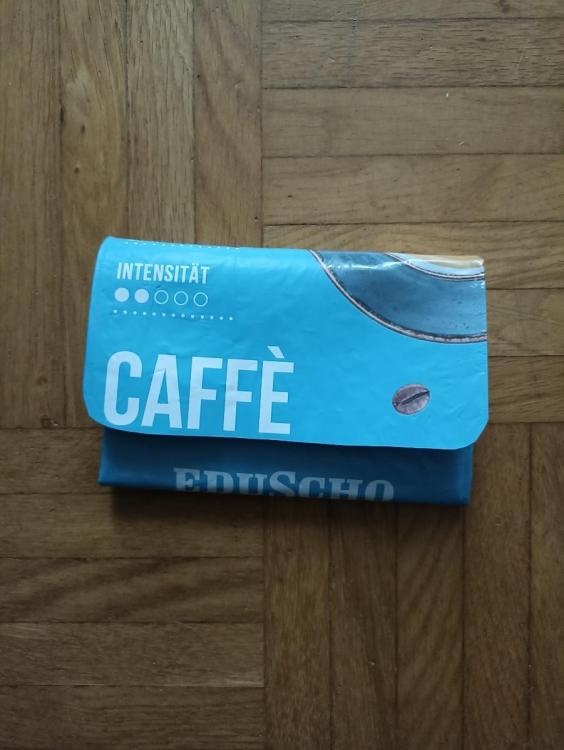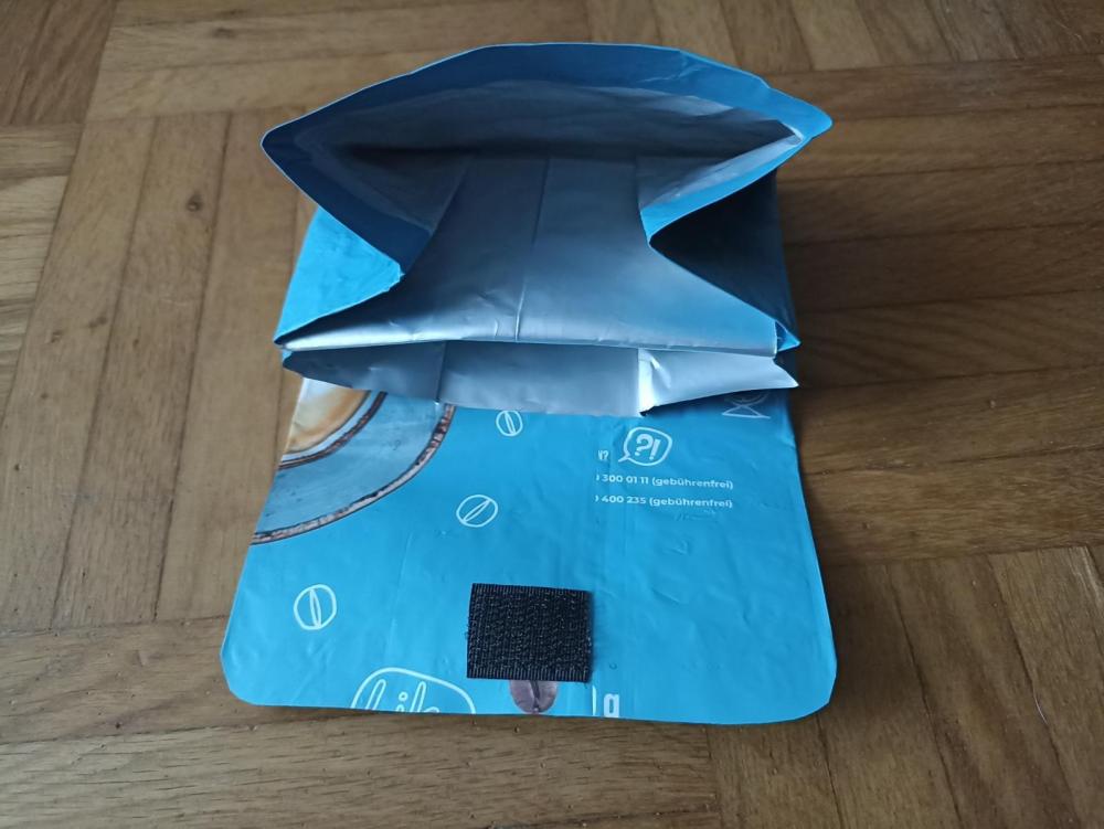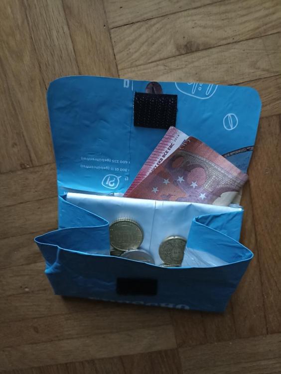 Eine kleine MYOG-Bastelei - ausnahmsweise mal ohne Nähen. Ein Geldbeutel aus einer Kaffeetüte. Bei mir im Büro nutzen wir einen Kaffee - Vollautomat. Dabei fallen immer wieder Kaffeetüten an, die an sich sehr stabil sind. Innen sind sie mit einer Plastik und einer Alu-Schicht beschichtet, außen befindet sich eine bedruckte Plastikschicht. Ich habe mich ja immer gefragt was man daraus machen könnte und blieb immer wieder gedanklich bei kleinen Geldbeuteln oder Taschen hängen. Nach der Anleitung aus einem Youtube-Video habe ich dann einen Prototyp für einen Geldbeutel gebaut. Der Vorteil hierbei ist zum einen die Alu-Beschichtung der Tüte. Dadurch wird der Inhalt RFID-Sicher. Das heißt Scheck-/Kredit-Karten usw. können nicht von außen ausgelesen werden. Das Kartenfach befindet sich an der Seite. Der zweite Vorteil: Gewicht 16 g Damit ist das Teil leichter als meine bisherige, gekaufte Variante von Sea-to-summit.1 Punkt