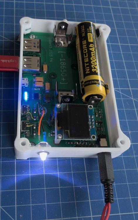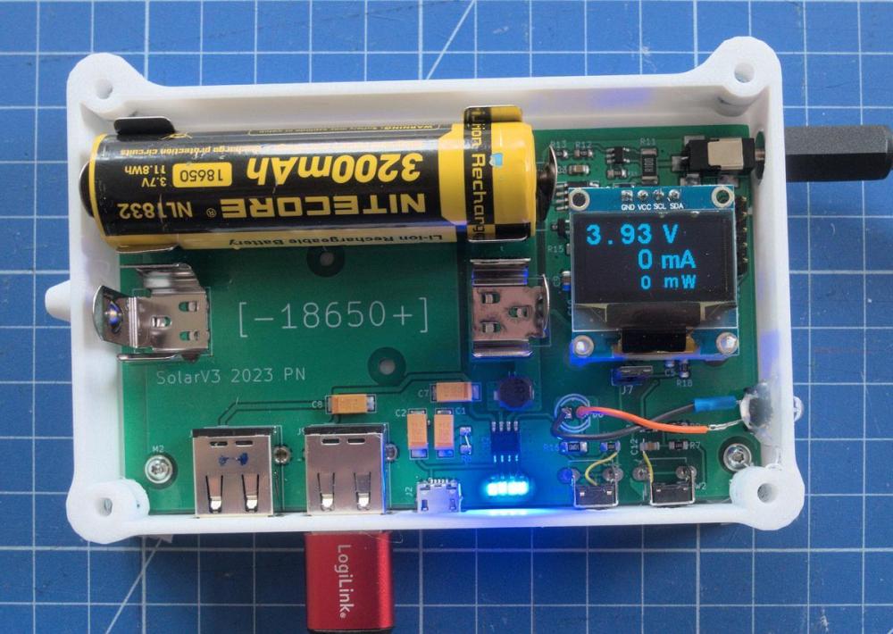 Seit einiger Zeit verwende ich erfolgreich kleine Solarpanels, zuletzt auf dem südlichen Kungsleden. Da ich aus unterschiedlichen Gründen mit dem direkten Zusammenhängen von Panel-USB-Ausgang mit Powerbanks nicht zufrieden war, hat sich schrittweise eine MYOG-Lösung entwickelt. Ziel war: den Ladestrom und die Akkuspannung ablesen zu können gleichzeitig via Panel den Akku laden und per USB einen Verbraucher laden zu können das Laden von Verbrauchern unterhalb des "Maximalstroms" zu ermöglichen eine zweite USB-Buchse um z.B. meine Nitecore-Taschenlampe aufladen zu können (diese lässt sich an einer PB normalerweise nicht aufladen, da sie zu wenig Strom zieht) als Gadget eine Mini-LED-Lampe einzubauen Die Spannungs/Strom-Anzeige wollte ich, weil mich unterwegs interessiert, wieviel Strom "getankt" wird auch wenn die Sonne nicht voll scheint. Ist jetzt nicht unbedingt nötig, aber es soll ja auch Leute geben, die ein Anemometer mitnehmen um zu messen, bei wieviel Wind ihr Zelt gerade noch steht, oder ein Thermometer, um festzustellen, wann man gerade noch nicht erfriert... das hier geht also in diesselbe Kategorie Das gleichzeitige Laden und Entladen finde ich absolut zentral, da ein kleines Panel nie durchgehend genug Strom liefert, und dann z.B. ein Telefon beim Laden aus dem Tritt kommt, wenn jemand vor dem Panel durchläuft. Auch möchte ich nicht nur nachts im Zelt laden können. Maximalstrom: Das Problem ist, dass viele Verbraucher (Handy) mit dem maximal möglichen Strom laden, den sie kriegen. Das geht zwar schnell, produziert aber auch viel Wärme und bringt Schaltregler an die Grenze (bzw. den thermischen Shutdown). @ChristianSz.B. hatte Probleme mit heiss laufenden Aliexpress-Ladereglern. Hier ist das Ergebnis der Bastelei, noch ohne Deckel: Rechts oben ist das Panel eingesteckt. Unten links 2 USB-A-Buchsen für die zu ladenden Geräte und eine Mikro-USB-Buchse zum Aufladen der Powerbank. Die 4 blauen LEDS unten sind die "normale" Powerbank Lade- und Entladezustandsanzeige. Das Display oben zeigt die Akkuspannung auf Knopfdruck für ein paar Sekunden an, sowie den Ladestrom und die Ladeleistung (hier Null da im Dunkeln). Die weisse LED rechts ist die "Lampe" für im Zelt. Der weisse Knubbel links am Gehäuse ist eine Öse zum Aufhängen. Im Moment scheint die Sonne kaum, ich habe aber das Panel in den Regen rausgehängt, um die Ladestrommessung zu demonstrieren (die Anzeige der Leistung ist unten abgeschnitten, weil offenbar der Refresh des OLED-Displays nicht gut mit dem Kamerasensor synchronisiert ist): Um das Panel auszurichten, gibt es einen Strom-Tracking-Modus, der für 30 Sekunden oder bis auf Knopfdruck den Ladestrom anzeigt: Hier noch ein Blick auf die LED. Ist jetzt nicht um draussen zu Wandern, aber um im Zelt was zu machen reicht es: Gewicht ist 188g bei Bestückung mit zwei 18650-Akkus gestückt. Wenn man dem Aufdruck von Nitecore und Ansmann traut, sind das 6700 mAh, also eine ordentlich grosse Powerbank. Der Mikroprozessor und die ganze Elektronik sind normalerweise im Sleep-Mode und wachen nur alle 30 Sekunden kurz auf, oder wenn eine Taste gedrückt wird. Im Sleep Mode verwenden sie 15 Mikroampere. Der Akku würde damit also 50 Jahre durchhalten (die Selbstentladung ist also deutlich höher).1 Punkt