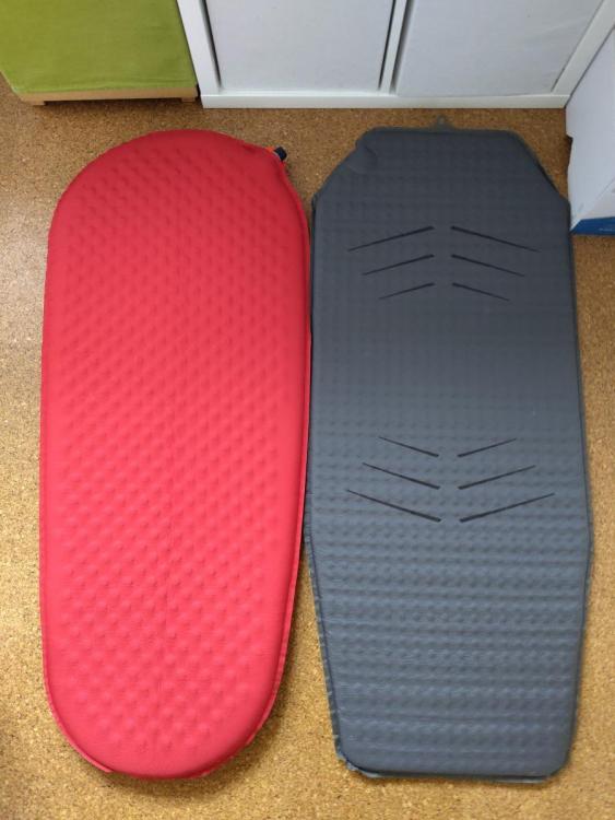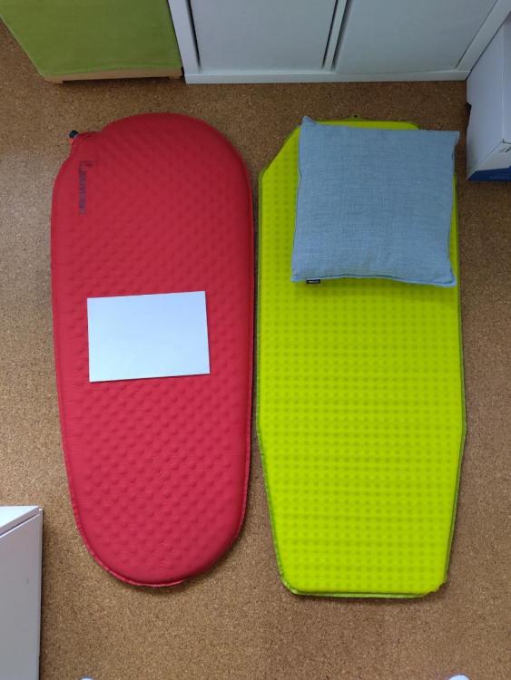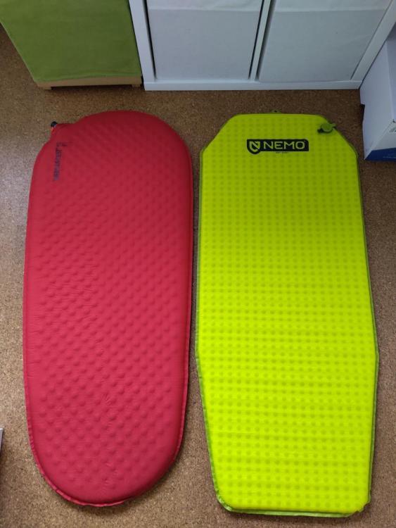 Soooo, Feedback: Erst einmal Danke an alle für eure Ratschläge! Zur Entscheidungsfindung hab ich mir eine schöne Excel-Tabelle gebastelt, so dass ich die Matten so wie Mattenkombinationen von R-Wert, Preis und vor allem Gewicht vergleichen konnte. Zusätzlich war ich noch in einem Outdoor-Laden (Lag auf der Strecke), der auch ein paar UL-Matten hatte und konnte da mal einige Matten in die Hand nehmen. Nach dem Ladenbesuch stand für mich fest, dass ich auf jeden Fall eine selbstaufblasende Isomatte mit Schaum haben möchte und keine reine "Luftmatratze". Letztendlich konnte ich mich nicht entscheiden und habe mir zwei Matten geholt 🙈 Zum einen die von @RaulDuke empfohlene Therm-a-Rest ProLite Plus Small. War in meiner Liste der schwerste Kandidat, jedoch gute Dicke und für unter 70€ im Angebot. Zum anderen habe ich mir aus Frankreich die von @Capere empfohlene Nemo Zor20 als Alternative zur Nordisk Ven bestellt. Hier die Daten: Therm-a-Rest ProLite Plus Small Maße: 119 x 51 x 3,8 cm Packmaß: Ø 12 x 26 cm Gewicht: 515g Hersteller / 520g mit Packsack nach gemessen R-Wert: 3,2 Nemo Zor 20 Maße: 122 x 51 x 2,5 cm Packmaß: Ø18 x 9 cm Gewicht: 295g Hersteller / 351g (!) mit Packsack nach gemessen (334g Matte + 17 Packsack R-Wert: 2,7 Woher die 40g extra bei der Nemo kommen ist eine gute Frage. Das Modell, das ich bekommen habe, hat ein komplett anderes Ventil als Matten aus Rezensionen im Internet (Siehe Bild 2). Jedoch sind die Rezensionen viele Jahre her. Vielleicht gab es da ein Modell-Update und niemand hat das Gewicht aktualisiert. Erster Eindruck: Bei beiden Matten ist das Aufblasen sowie das Zusammenrollen fix erledigt. Die Nemo ist in 10 Sekunden, die Therm-a-Rest (kurz TAR) in 20 Sekunden aufgeblasen. Beide lassen sich gut Rollen und in die Packsäcke zurück schieben, bei der TAR geht das etwas schwerer als bei der Nemo, jedoch immer noch angenehm. Die Nemo hat von Haus aus noch Anti-Rutsch-Streifen auf der Rückseite. Auf der Therma-a-Rest liege ich gut, die Hüfte drückt nicht durch. Die Nemo ist deutlich leichter und ich mag das Gelb. Jedoch drückt hier meine Hüfte durch, der Boden ist punktuell zu spüren (zur Erinnerung, ich bin bei 100kg, die Matte wird für leichtere Leute wohl besser funktionieren). D.h. bei der Nemo benötige ich auf jeden Fall eine Unterlage, während die TAR als alleinige Matte schon reichen könnte. Mit der Breite muss ich bei beiden Matten noch klar kommen. Kombiniert werden sollen die mit einer meiner Schaummatten: Einer Thinlight 1/8'' Faltmatte (96g), einer 3mm zurecht geschnittenen Evazotte (130g) oder einer zurecht geschnittenen Flexmat Plus (565g). Werde dann wohl verschiedene Setups auf Tour testen. Die TAR dann mit der Thinlight bzw. der Evazotte, die Nemo mit der Evazotte. Zur Not auch mal Nemo + Flexmat, jedoch muss das dann schon sehr kalt oder sehr bequem sein, um das Gesamtgewicht von ca. 915 g zu rechtfertigen. Und hier noch ein paar Bilder. Zum Größenvergleich auf Bild 1 eine 1L Milchtüte, auf Bild 3 ein Sofa-Kissen und ein Din A4 Papier:1 Punkt