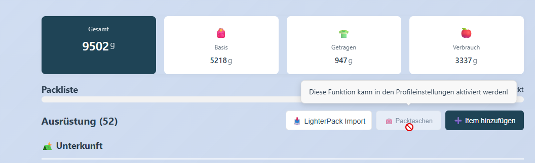 So nochmal ein Update von gestern: Ich noch den Importer deutlich verbessert...hab die Stückzahl aus LitherPack gar nicht beachtet! Der Importer fügt jetzt allen Items die als getragen/worn bei LighterPack eingestellt waren auch so ein. Egal welche Kategorie. Jetzt werden die Gewichtsangeben 1zu1 aus Lighterpack importiert aufs Gramm genau (hab die Anzahl der Items vorher nicht beachtet), ist mir irgendwie so lange nicht aufgefallen! Mehrere Items können nun per Klick in der Planung ausgewählt werden und als Gepackt markiert werden oder als "Getragen" markiert werden. Erst dann wird das "getragen" Icon angezeigt. D.h. jetzt kann man den Importer nochmal laufen lassen. Die passenden, und auch seine Custom Kategorien vorher anlegen und die Items werden dann perfekt in eine Planung/Liste überschrieben. ## ✨ Neue Features ### 06.02.2026 ### 🔄 LighterPack Import - Items Überschreiben - Neue Checkbox-Option "Vorhandene Items überschreiben" im Import-Dialog - Bereits existierende Items können jetzt aktualisiert werden (Gewicht, Kategorie) - Ergebnis-Anzeige zeigt separate Listen für: - Neu importierte Items (grün) - Aktualisierte Items (blau) - Übersprungene Items (grau) - Funktioniert sowohl im Items-View als auch im Trip-Import ### 👕 LighterPack Import - Getragen & Verbrauchsmaterial automatisch erkennen - CSV-Import liest jetzt die "worn" und "consumable" Spalten aus LighterPack Exports - Items mit "Worn" Flag werden automatisch als "Getragen" markiert - Items mit "Consumable" Flag werden automatisch als "Verbrauchsmaterial" markiert - **🔢 Anzahl (qty) wird jetzt korrekt importiert** - Items mit qty > 1 werden mit richtiger Menge hinzugefügt - Funktioniert für alle Kategorien (nicht nur Kleidung) - Gewichte werden korrekt in Basisgewicht/Getragen/Verbrauchsmaterial aufgeteilt - 🐞 **Bugfix**: Aktualisiert jetzt auch Gewichtstyp "getragen" und Item Anzahl für bereits im Trip vorhandene Items beim Überschreiben ### 🎨 LighterPack Import - Button & Modal Styling - Import-Buttons haben jetzt schönen Hover-Effekt und Schatten - Close-Button (X) mit modernem Design und Hover-Animation - Konsistentes Design mit Profil-Einstellungen ### 🔄 Mehrfachauswahl & Bulk-Aktionen - Mehrfachauswahl von Items jetzt auch ohne aktivierte Packtaschen-Funktion verfügbar - Neue Bulk-Aktionen für ausgewählte Items: - ✅ "Als gepackt markieren" / "Als nicht gepackt markieren" (dynamisch) - 👕 "Als getragen markieren" - 🗑️ "Aus Packliste entfernen" - Mehrere ausgewählte Items mit einem Klick aus der Reise entfernen - Intelligenter Pack-Button: Ändert sich automatisch je nach Status der ausgewählten Items - Hover-Effekt und grüne Auswahl-Hervorhebung in allen Ansichten ### 👕 Getragen-Button Optimierung - Button wird standardmäßig nur bei Kleidung angezeigt - Bei anderen Kategorien: Erscheint wenn Item als "getragen" markiert wurde - Ermöglicht das Markieren beliebiger Items als getragen (nicht nur Kleidung) - Gewicht fließt korrekt in die "Getragen"-Berechnung ein _______________________________________________________________ Frage an euch, oder soll ich eine neue Umfrage aufmachen? eher nicht oder? Aktuell wird das Gewicht auf/abgerundet. Also Komma zahlen 27.4 Gramm wird zu 27 Gramm und 27.6 Gramm wird zu 28 Gramm. Fürs UI und Auge ist es besser ohne Komma gleichzeitig wird das Gewicht minimal verfälscht. Ich persönlich bin nicht so kleinlich und das Auf und Abrunden past für mich. Aber was sagt ihr?2 Punkte -