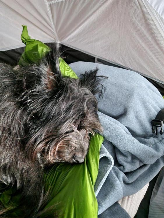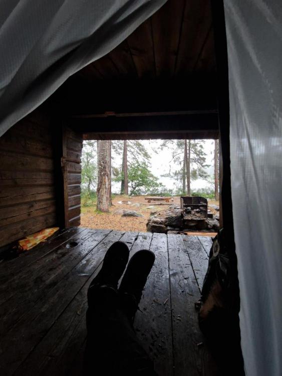 Für Tag zwei war schon klar: Heute gibt es Regen. So ab Mittag. Bis dahin wollte ich also an der nächsten Schutzhütte sein, was kein Problem sein sollte, da es bis dort nicht weit war und ich früh (gegen 8:00) nach einem gemütlichen Frühstück losgelaufen bin. Ach so, noch was zur Länge der Etappen: Sportliche Ambitionen in Sachen Geschwindigkeit oder Etappenlänge hatte ich gar nicht. So drei bis vier Stunden Wanderzeit maximal pro Tag waren angesetzt. Mir ging es im Urlaub ums Draußen sein und Natur und Einfachheit und Ruhe genießen. Rumgucken, mit Hund Spaß haben, Essen, Lesen, Ausruhen. Es war zu Beginn erstaunlich schüler Wetter und ich schnell verschwitzt. Zwischendurch kleine Regenschauer, für die der mitgeführt Schirm angenehm war. Das Mitführen eines Schirmständer war Premiere - im letzten Winter habe ich Schirme schätzen gelernt. Für mich als Brillenträgerin toll, weil klare Sicht erhalten bleibt. Leider regnete es sich etwa eine Stunde vor dem Ziel ein, also kurz den Hund unterm Regenschirm geparkt und die Schlechtwettermontur aus Regenjacke und Regenrock (aka Groundsheet vom Lanshan 1) angelegt und weiter gestapft. Ca. 1km vor der Hütte gab es leider eine Rodung, durch die sich zu kämpfen etwas nervig war, da überall noch Stämme lagen. Dann erschien auch noch ein Maschine zum Einsammeln der Bäume hinter uns und erschreckte den Hund etwas. Im strömenden Regen freuten wir uns sehr über die Schutzhütte, in der wir uns gemütlich einrichteten. Es regnete nicht nur den ganzen Tag weiter, sondern es kam noch Wind dazu, der den Regen bis zur Hälfte in die Hütte trieb und unangenehm zog. Also schnell das Innenzelt in die Hütte gebastelt, in dem wir warm und geschützt waren. Im Wald hörte man den ein oder anderen Ast brechen und sogar zweimal einen Baum in der Umgebung fallen. Große Dankbarkeit für die tolle Trail-Infrastruktur! Der restliche Tag bestand aus Essen, Lesen und Schlafen oder dem Wetter Lauschen. Herrlich!8 Punkte -