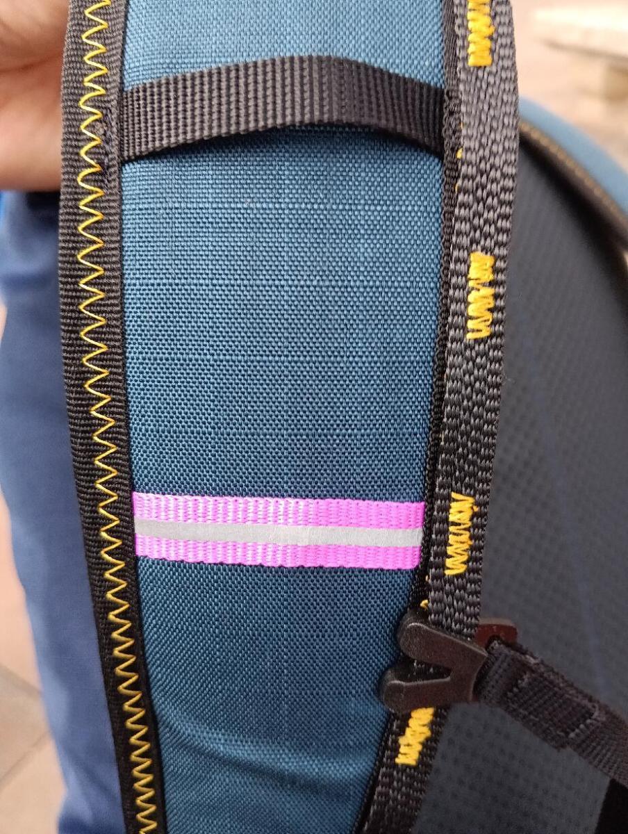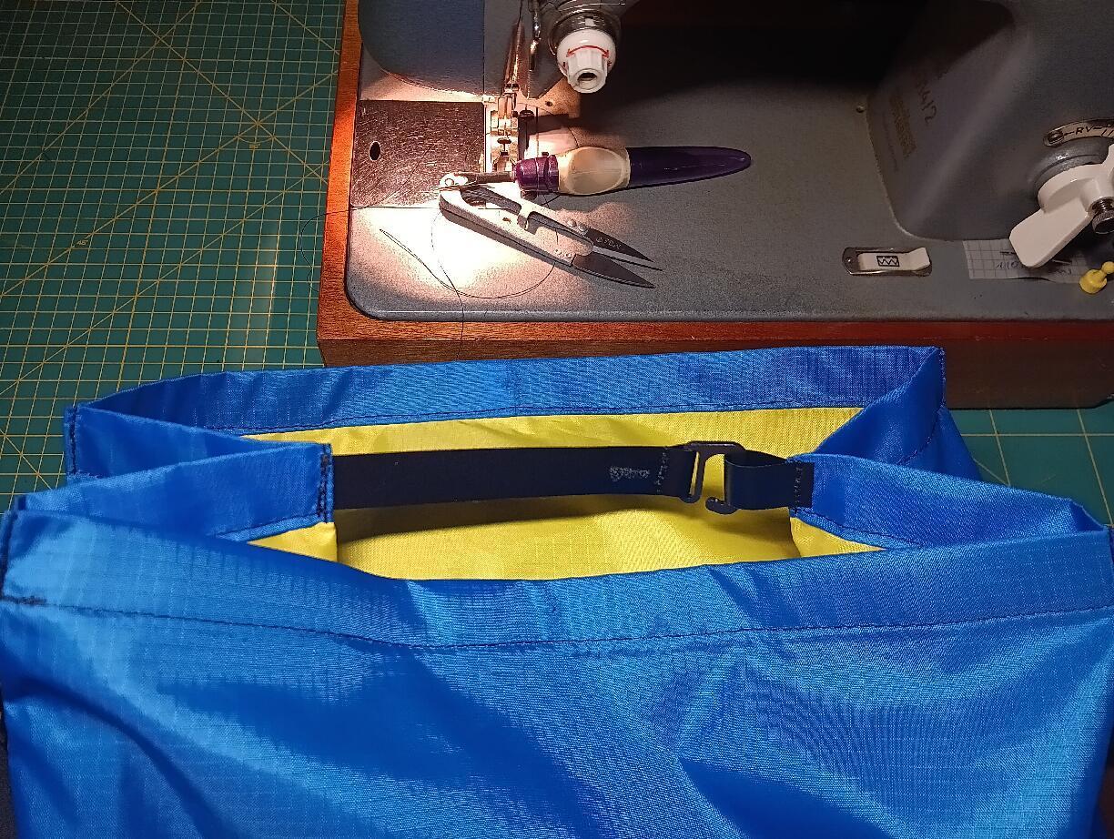 Etwas zum Nähen und den Features: Die Träger wurden aus mehreren Lagen genäht: 300den RS Cordura 5mm Evazote (aus Isomatte gewonnen) 5mm offener Schaumstoff (aufgrund Mindestbestellmenge habe ich jetzt einen Vorrat fürs Leben) festes Netzgewebe (Eyelet? Müsste mal alte extex Rechnunge rauskramen) Die Träger wurden, teils durch Teppichklebeband fixiert, am Rand zunächst mit Zickzackstich geheftet und dann wurde 20mm Ripsband angesteppt. So kann ich optimal alle Schlaufen anbringen und erhalte mein gewünschtes flaches Design. Ein sehr spezielles Feature sollte ein absolutes Low-Profile Band sein, für Reflektoren oder Blinkies. Habe ich mir irgendwo abgeschaut, natürlich. Die Verstärkung mit Schrumpfschlauch erforderte eine spezielle Methodik: man schrumpft ein passende Stahlmaß mit ein, dann schrumpft es nicht zu klein. Man könnte auch ein passenderes Material mit der korrekten Endgröße verwenden, aber das hatte ich nicht. Bei den Schlitzen ist Präzision vonnöten. Abgesteppt dann mit schmaler Raupe AKA Bartack: Anschließend mit einer übriggebliebenen Tube Reparaturkleber rückwärtig versiegelt. Hoffentlich hält das Zeug, ich hatte leider keinen Seamsealer da, war wieder mal alle. Das Innenleben, das muss vor allem hell sein, die Augen werden ja auch nicht besser: Ja, ist ein spürbarer Mehraufwand, aber extra für Euch habe ich mal den Taschenrechner gequält: bei ca. 0,7m² Inlinerfläche mit 70g/m² Flächengewicht kommt man auf rund 49g. Und es ist sehr wasserfest sowie extrem handlich, man spart sich die Hantiererei mit Müllsack-Inlinern, die nach einiger Zeit dann selber Müll sind. Nach der Tour hatte ich dann Zeit, die innere Befestigung am Wandermädelrucksack vorzunehmen. Dazu verwende ich ein festes planenartige Material von extex, das ist auch teilweise als Verstärkung im Hohlsaum drin. Das ist definitiv nicht auf meinem Mist gewachsen, wollte ich aber mal als sehr schlanke Lösung probieren. Man wickelt tatsächlich einen sehr kompakten, faltenfreien Falz, scheint zu funktionieren. Aber ich hatte wieder mal etwas ELEMENTAR wichtiges vergessen! Dann suche ich jedesmal nach einer Fläche, wo ich das da noch rantackern kann, ohne „Dichtflächen“ zu lochen. Das ist nur ein Spaßetikett, ich nähe im Grunde nur für mich (und das Wandermädel): Verwendete Garne und Nadeln: belastete Stellen 60er Aman Serafil / Seraton und 100er Jeansnadel mit „Titan“beschichtung unbelastete Stellen, vor allem der Liner: 60er Microtex-Nadel und Corespun (müsste 75er sein) Warum die 60er Microtex? Die 70er habe ich alle beim Tarp Nähen verbraucht, da bleiben die 60er über. Maschinen: Gritzner Tippmatic 1035 mit DFT Schließnähte mit der guten alten Veritas 8014/2 aus den 50ern7 Punkte