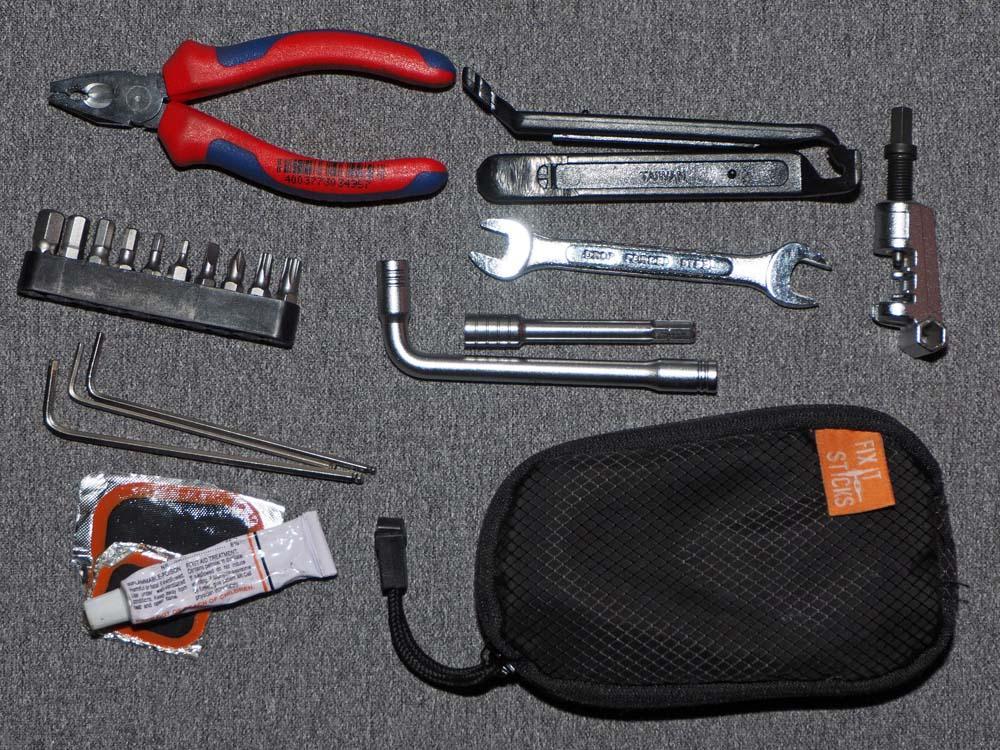 Hier ist mein Setup. Torx und Inbus nehme ich als Bits mit, außer den ganz kleinen, die sind als Inbusschlüssel auch nicht schwerer und passen leichter in die Öffnungen. Der große 8er Inbus Bit links ist selten, brauche ich aber für Pedale und Ständer und manchmal am Sattel. Gezeigt ist die Standardbestückung, das tausche ich dann passend zum Rad. Nicht immer brauch ich alle 8. Die Bits und der L Winkel stammen von einem Set aus Amazon, die Bits bei Bedarf eben austauschen. Das kurze Stück brauche ich vor allem für den Kettennieter und ggf als Verlänger und stammt aus dem Bitset eines Swiss Multitool Den Reifenheber und der 8er + 10er Maulschlüssel stammen aus einem größeren Fahrrad Werkzeugkoffer Der Kettennieter ist sehr gut und stammt wie die Tasche aus diesem Kit. https://www.enjoyyourbike.com/Fahrradwerkzeug/FixItSticks-Commuter-Kit-Schraubendreher-Set-Reifenheber-Kettennieter-Tasche::12991.html Das andere Zeug aus dem Set ist auch gut, aber mir zu schwer. Von Multitoolzangen halte ich immer weniger. Wenn eine Kombizange, dann nehme ich am Fahrrad die kleine Knipex mit, die ist leichter und trotzdem besser. Was auf dem Bild leider fehlt sind die Kettennietstifte. Die hab ich beim letzten Mal gebraucht und dabei wohl verschmissen Man kann auch etwas leichtern Kram mitnehmen, z.B. beim Kettennieter ein paar wneige Gramm einsparen oder so ein billiges Inbus Multitool verwenden. Ein lausiger Kettennnieter ist ein Elend und unterwegs bei Dreck und Kälte kann das das Ende der Tour bedeuten und von den Inbus Multitools habe ich schon live gesehen wie die gleich beim ersten Mal benutzen versagt haben. Mit etwas Ungeschick dreht man sich auch gleich noch den Schraubkopf rund, dann ist es so richtig beschissen Meine Philiosophie: Wenn schon Werkzeug, dann eins das zu 100% funktioniert und nicht nur zu 99% notfalls irgendwie. Auch mit eiskalten Händen und festgegammelten Schrauben. Manchmal führt schlechtes Werkzeug dazu, dass man noch mehr zerstört. Mit jedem der gezeigten Werkzeuge lässt sich genauso gut arbeiten wie mit dem "richtigen Werkzeug" zuhause. Speichen musste ich unterwegs noch nie unbedingt sofort nachziehen. Nicht gezeigt aber meist auch noch dabei 15er Ringschlüssel (falls mit ebike und Nabenmotor unterwegs, die Achsmuttern muss man mit 40Nm anziehen, dafür braucht es etwas Hebelarm und was stabiles) Ersatzschlauch Luftpumpe etwas Klebeband ggf. Brems- und Bowdenzug 20ml Bio-Öl MfG Gewicht wie gezeigt 360g, davon 27g die Tasche.