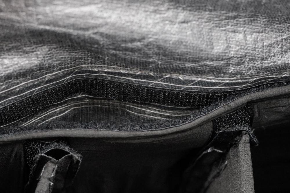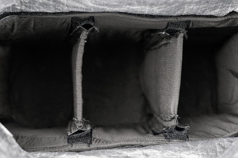 @izi Ich danke dir! Ich fand drei Tage ganz schön lang – hab im Vorhinein aber einfach die Denkzeit für die ganzen Konstruktionsschritte und neuen Austüftelungen wie Schultergurt- und Hüftgurttaschen unterschätzt. So hab ich aber einigen Fortschritt bei meinen Hörbüchern gemacht und hatte viel Spaß Der Frame ist so gebogen, dass er in seiner Rundung der Wirbelsäule folgt und möglichst rückennah verläuft. Durch das Absenken des Gewichts auf den Hüftgurt kommt dennoch ein gewisser Abstand zum Rücken zustande, sodass der Rucksack nicht direkt aufliegt. Ich mag den Frame auch sehr. Ich habe lange überlegt, ob ich nicht einfach zwei Alustangen nehme, die leichter wären. Allerdings würde dann die horizontale Spannung fehlen. Mit diesem Frame-Sheet merke ich ganz deutlich die Spannung über die gesamte Breite des Frames. Hier ist ein Bild aus dem Inneren. Ich habe die Hülle vorerst mit Tape nur eingeklebt. Im aktuellen Zustand ist der Frame daher nicht entnehmbar. Nähen wollte ich zwecks Wasserdichtigkeit vermeiden (ich müsste ja beide Seiten der Nähte, innen und außen von der Hülle, abdichten). Und für ein ausgefeilteres Konstrukt, bei dem das obere Ende der Hülle zum flexiblen Einspannen abgetrennt und durch Klett verbunden würde (wie beim AtomPacks), fehlte mir schlichtweg die ausreichende Länge an Tape. Das werde ich nachbessern, sobald meine neue Bestellung eintrifft. -