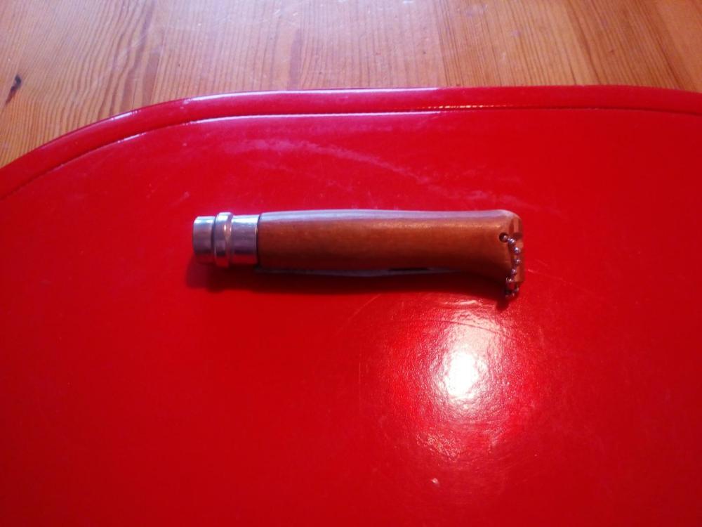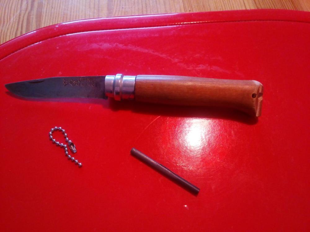 Nur für die, die tatsächlich ein Messer auf Tour mitschleppen! Meist ist das ja ein Vic classic, aber einige präferieren ja Opinel...da mal schnell ein alter, aber sinnvoller Mod: Ich hab nur hinten ein Loch längs in den Griff gebohrt und ein dünnes Löchlein quer - so passt ein kleiner firesteel in den Griff. Gerade bei Wind ist es m. E.viel leichter ,nen Gas- oder Spirituskocher mit diesem zu entzünden als mit nem Minibic! Damit der nicht verloren geht, wird er mit so einer kleinen Kugelkette gesichert: Das ist nun ein 8er Opinel, geht aber auch mit nem 7er. Noch kleiner sollt's nicht sein, dann wird der firesteel zu mickrig ( und das Messer auch...) -