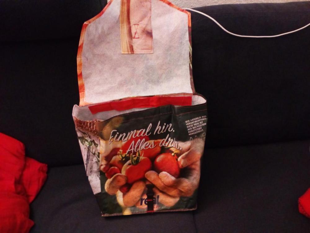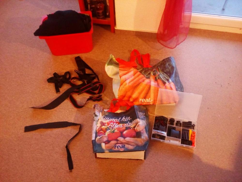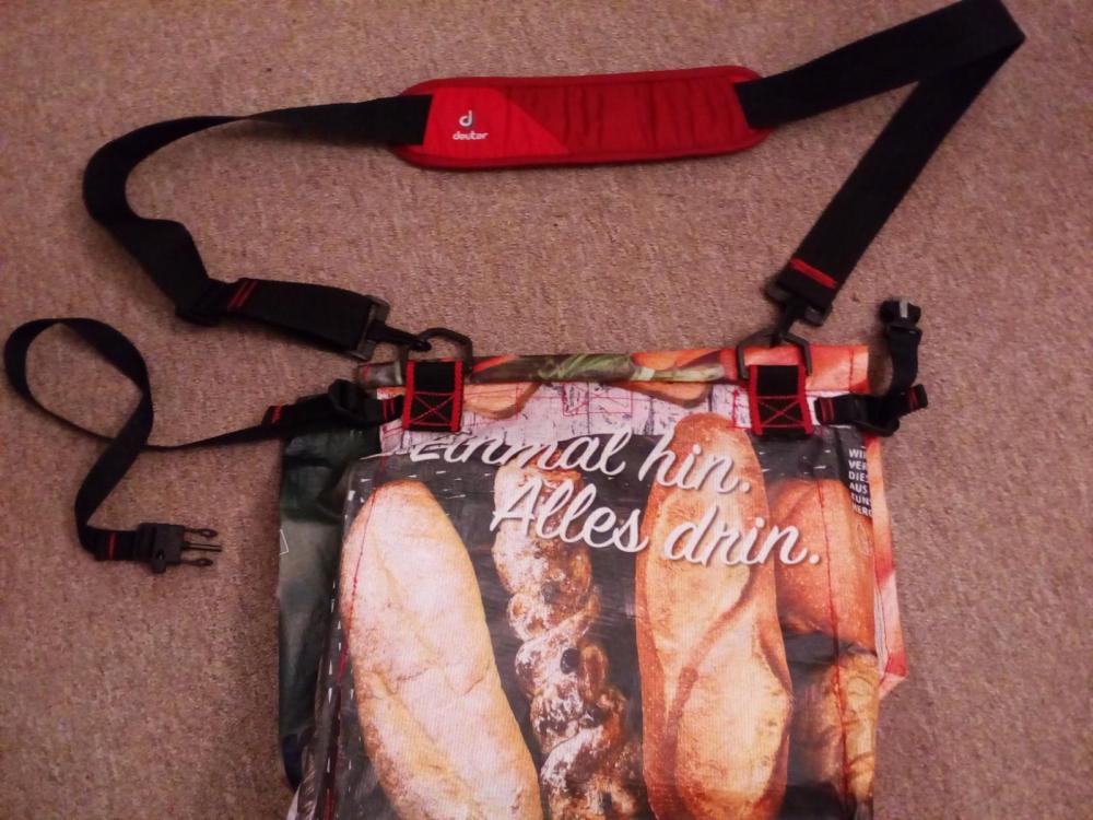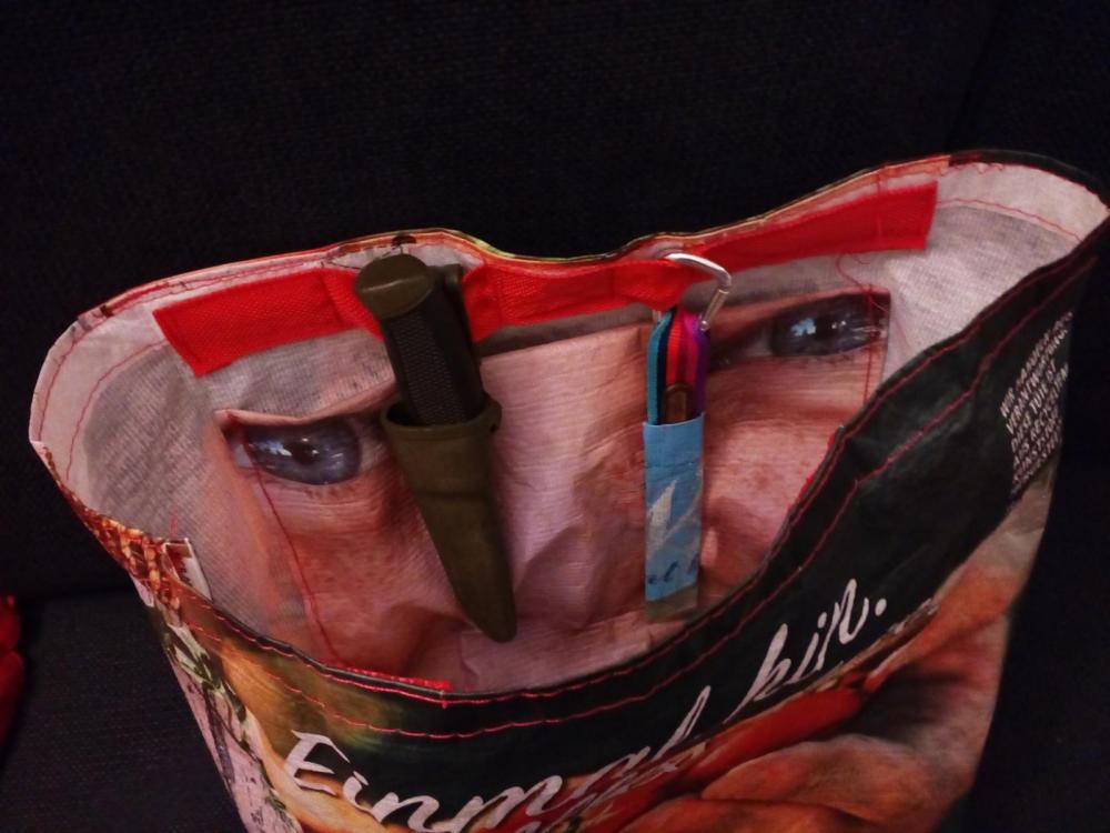 Ich hab mit mir gerungen, ob ich das hier überhaupt posten kann...so echt UL isses nicht. Aber eingedenk dieses Fadens uund des dortigen posts von @TappsiTörtel, sinngemäß"wir verbrauchen Plastik ohne Ende, um 100 g leichter zu werden" , dachteich , es könnt' schon passen. ( Und mein Bastlerstolz , natürlich) Ich hatte da auf ner kleinen Runde ins Grüne, so von der Haustür an, ein "Luxusproblem": kaum los, lag da die erste Pfanddose - also Rucksack ab, einstecken, Rucksack wieder rauf, mit dicker Jacke und Kapuze ein Gewürge. 50 m weiter die nächste Dose, Rucksack ab...usw. Als ich dann noch n Sack Kartoffeln fand ( kann man ja nicht umkommen lassen) ,reifte der Plan, eine Umhängetasche zu bauen. Leicht musste sie sein, klein verpackbar, damit sie (zunächst) im Rucksack auf den Einsatz wartet, auswaschbar, stabil - und low budget! Also Material gesichtet, ich hatte da noch einige Taschen von Supermärkten ( hier am Pfandautomat schmeißen viele Leute die guten Gewebetaschen weg, nur weil da n bisschen Bier oder Wein ausgelaufen ist) und jede Mwnge Gurtband, Schnallen usw. von diversen Zerlegeaktionen, Sperrmüll etc. Zwei real-Taschen wurden es, eine hatte genau die passende Größe (nb. Das nächste Mal zerleg ich alles vorher - was in eine fertige Tasche zu nähen ist ja eher friemelig!) Tolle Motive drauf, also aus der Rückwand der größeren Tasche eine Innentasche für meinen Silbersitz/Polster genäht: Mögliche Taschendiebe sollen sich beim Offnen ruhig beobachtet fühlen! Dann den Deckel genäht Soll ja schick sein! Und drangenäht. Tasche von vorne... ...von innen ( mit scavenger-Werkzeug) ...und von hinten: Neben der Aufhängung des Schultergurtes sind noch Kippschnallen angenäht, daran kann ich einen Bauchgurt anbringen, damit die Tasche beim Radfahren nicht zwischen Knie und Lenker rumbamselt. Beim Gehen nervt mich aber rumhängendes Gurtzeug, deshal abnehmbat ( und weil die Schnalle des Bauchgurts auch Signalpfeife und firesteel beinhaltet, leichter zu verwenden, falls ich mal im Container feststecke und Notsignale geben muss, oder wenigstens ein wärmendes Feuer anfachen...) So sieht das gute Stück übrigens von vorn aus. Schick, oder? Null Euro, nix Neues für gebraucht, nur recycelt. Ach ja, Gewicht... Tasche mit Schultergurt 188g. Das Polster ist schwer... Inhalt ungefähr 16 l, Deckel ist aber ja höhenverstellbar, falls ich mal was Größeres wie einen Grillrost o.ä.finde. Bauchgurt: 24,2 g. Zusammengepackt rel. klein: Geht auch ohne "neu kaufen, extex, ripstpbytheroll etc". Macht mich aber keinstenfalls zum guten Menschen - ich hab nur n Mordsspaß an so'm Scheixx! So, vergebt mir , dass mein Bastlerstolz obsiegt hat. Ich musste das einfach zeigen LG schwyzi