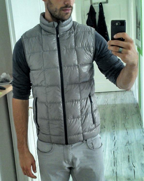 Sorry, für die verspätete Antwort. Bin eig nicht so der Selfie-Typ ( ) aber hier mal nen Bild bzgl. Passform... Bin 184cm groß und wiege knapp über 80kg. Jacke ist größe M und wiegt 183g out of the box. Jedoch natürlich ohne mitgeliefertem Packsack aus gleichem Stoff wie die Weste selbst.