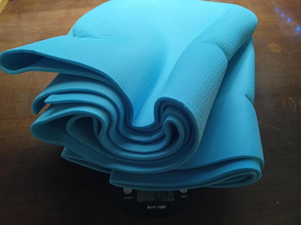 Dank Khyal's Empfehlung bin ich umgestiegen auf die 4mm EV50 von Extremtextil. Geliefert wurde eine schön-glitzernde Matte mit 207x102cm und 368g. Zurechtgeschnitten auf luxuriöse 190x65 wiegt sie jetzt 210g und hat doppelt gefaltet und dann zusammen gerollt ein Packmaß von ca. 35x15cm. Macht einen stabil-weich-warmen Eindruck, ich bin zufrieden. -