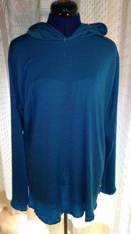 Nachdem sich der sogenannte Sunhoodie von Appalachian Gear (Alpaca/Tencel) als für mich viel zu warm herausgestellt hat, um das Teil ernsthaft bei sommerlichen Temperaturen zu tragen (Herbst und Frühjahr geht sicherlich gut) und @izi hier neulich einen neuseeländischen Versender von Merino- und Merinomix-Stoffen eingestellt hatte, habe ich dort zugeschlagen und 150er Merino mit Tencel-Beimischung (die 1,5 Stücke sind derzeit wohl gerade ausgegangen, ich hatte noch zwei in unterschiedlichen Farben bekommen, das reicht äußerst locker für einen Hoodie und es bleibt noch genügend verwertbarer Reststoff übrig) bestellt (neben 120er Corespun) und möchte dem Thema Merino-Sunhoodie so noch eine weitere Chance geben. Erfahrungen mit Sunsleeves haben auch gezeigt, dass ich bei Hitze möglichst weit geschnittene Kleidung besser vertrage und so ist es ein ziemliches Oversized-Modell geworden, auch in der Länge - möglicherweise kürze ich es aber nochmals. Im Moment liegt das Gewicht bei 227g. Es ist bis auf die kurzen Nähte an den Daumenlöchern komplett auf der Overlock genäht, Säume mit Wavenaht (hab ne neue, die das kann und finde das ganz hübsch). Längeres Tragen steht noch aus, ich werde berichten. -