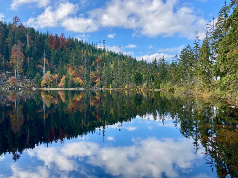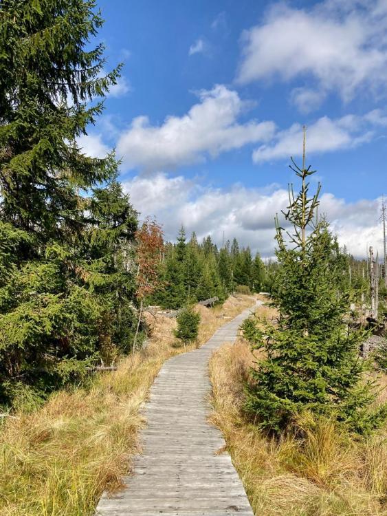 Tag 5 – Modrava bis Prášily Heute ist die längste Etappe, also das Zelt kurz ausschütteln, einpacken und weiter. Was für ein Tag! Die Gegend um Modrava ist zu Recht eine der meistfrequentierten. Jetzt habe ich die carexbewachsene Hochebene um den Rolandský potok für mich alleine. Den Sonnenaufgang im Rücken mache ich einen kurzen Abstecher zum Tříjezerní slať - dem Dreiseen-Moor. Der Morgennebel hängt tief über dem Moorseen, Spinnennetze voller Tau glitzern in der tiefstehenden Sonne, und alles ist still. Bei Kilometer 8 lasse ich mich zu einer gediegenen Frühstückspause nieder. Die Asphaltstraße ist von der Sonne aufgewärmt so dass ich darauf sitzen kann, im kleinen Bach kann ich Wasser schöpfen und Kaffee kochen, und die Schranke dient als hervorragendes Zelt-Trockengestell. Damit kommt man ins Gespräch mit dem älteren Pärchen, das vorbeiwandert. Danach geht aues auf den Poledník – der Aussichtsturm mit dem gewöhnungsbedürftigen Erscheinungsbild (und militärischer Vergangenheit) ist zwar im Herbst nur am Wochenende für Besucher geöffnet, aber wenigstens gibt es im Kiosk Wurst, Kuchen und kalte Getränke. Verleibe ich mir in der Reihenfolge ein. Hier gibt es auch eien Biwakplatz, aber ich bin erst seit 12 Kilometern unterwegs. Der Sturm Kyril hat das Werk der Borkenkäfer vollendet und es präsentiert sich eine fast surreal erscheindende Ödnis. Da das Wetter so schön ist hier oben faulenze ich noch ein wenig auf dem Gipfel, lese, stretche und hole mir einen sagenhaften Sonnenbrand. Der Abstieg ist tough für mich, immer nur bergab auf Asphalt und Schotter, erst streiken die Knie, dann die Wade und am Schluss die Hüfte. Ich bin erleichtert als ich den befestigten Weg endlich verlasse und über einen steinigen Pfad zum Prasilske jezero aufsteigen kann. Der Himmel ist klar, der Bergsee liegt still und strahlend umgeben von sich färbenden Bäumen. Danach folgt nur noch der Abstieg nach Prášily – zunächst über steinige Waldpfade, am Schluss leider wieder Asphalt. Ich schleppe mich auf den Campingplatz in Prášily – diesmal ein echter Lagerplatz (tsch. taboriště), mit Dusche! Einfach, aber sogar eine Steckdose ist vorhanden. Im Ort gibt es Gaststätten, eine Konditorei und sogar ein kleines Lebensmittelgeschäft, das ich am nächsten Morgen aufsuchen will. -