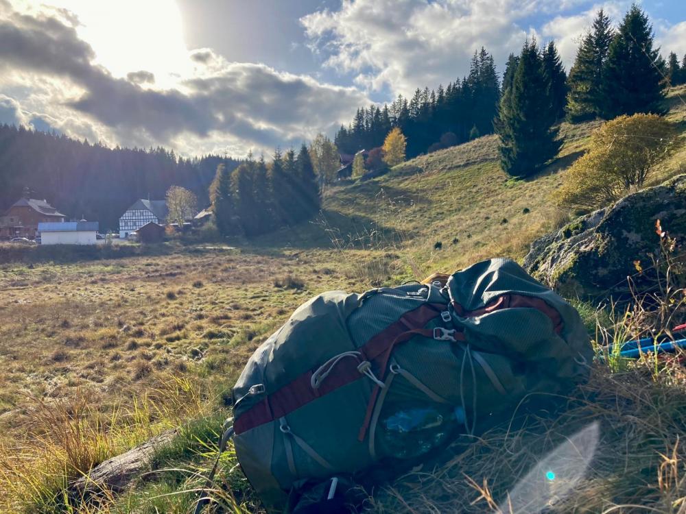Tag 4 – Bučina – Modrava Am nächsten Morgen frühstücke ich (entgegen meiner Gewohnheit) was reinpasst, fülle alle Flaschen auf – heute komme ich an keiner Quelle vorbei - und mache mich auf den Weg. Der Sonnenaufgang übertrifft den Sonnenuntergang vom Vorabend noch. Mein erster Weg führt mich zur Quelle der Moldau, der Mutter aller Flüsse – hier in Tschechien ist das fast schon ein Pilgerort. Die Quelle ist überraschend unauffällig. Ein toter Fisch und ein angebissener Apfel dümpeln in dem Loch herum. Daneben pinkelt gerade ein Radfahrer. Ich verzichte – entgegen meines Vorsatzes – einen Schluck aus der Quelle der Moldau zu nehmen und laufe weiter. Jetzt wird es gigantisch. Ich mache einen Umweg in die Einöde Březník. Für mich wunderschön, die Weite, die sanften Hügel, der Himmel. Nur ein bisschen viele Radfahrer unterwegs. Das Bistro dort hat leider wider Erwarten geschlossen, also gibt es eine Fruchtschnitte zu Mittag. Immerhin scheint das Wasser aus der Quelle frisch zu sein. Ich filtere trotzdem zur Sicherheit, dadurch kann ich noch ein bisschen länger in der Sonne sitzen. Gegen drei komme ich schon wieder an meinem Ziel an – Modrava, das Touristenzentrum (neben den Skiorten). Verdammt, ich hab das in der Planung echt falsch eingeschätzt. Schon wieder so viel Zeit zu verplempern… Aber in Modrava ist das einfach. Zunächst suche ich den Lebensmittelladen auf (den einzigen auf meiner Route). Der hat zu, die Besitzerin lässt mich aber aus Mitleid trotzdem rein. Brot ist allerdings von vorgestern, auf dem Obst tummeln sich die Fruchtfliegen – also greife ich mir zwei Müsliriegel und verschwinde schnell wieder. Seit Mittag verfolgt mich das Bild einer Sahnetorte, also steuer ich das nächste Cafe an und inhaliere eine sagenhaft gute Himbeertorte und drei Espresso. Danach schlendere ich zum Biwakplatz, schon einer da – der wartet aber auch auf den Abend… Der Platz liegt wunderschön direkt am Fluss. Also zurück nach Modrava, am Hügel gibt es noch ein wenig Sonne – ich lege mich auf meine frisch erstandene Regenjacke und lese ZWEI STUNDEN mein Buch. Herrlich. Sonnenbrand inklusive. Danach steuere ich die Brauereigaststätte Lyer an und ordere einen Grillkäse auf Salat und ein kleines Bier. Immerhin muss ich ja noch mein Zelt aufbauen. Fünf Minuten später steht ein Birnenschnaps vor meiner Nase, die beiden Mädels am Nachbartisch haben sichtbar gute Laune seit längerem, und „wir Frauen müssen ja zusammenhalten“. Hätte ich doch mein Zelt schon vorher aufgebaut. Die Nacht verbringe ich trotzdem wohlbehütet im irgendwie akzeptabel aufgebauten Zelt. Am nächsten Morgen will ich die Zeltplane beiseite rollen – und falte sie. Steinhart gefroren.