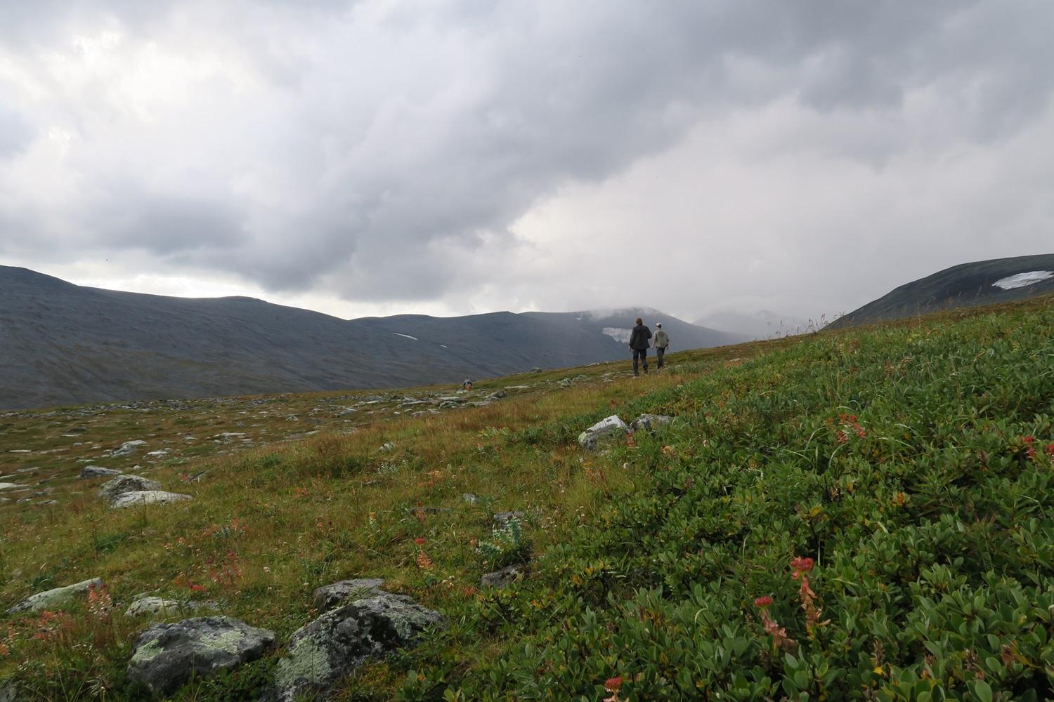 Nachdem wir den Morgen in der Hütte in die Länge gezogen hatten, da niemand in seine kalten nassen Socken und Schuhe wollte, ging es mal wieder über eine steinige Hochebene Richtung Parek. Auf dem Weg trafen wir noch eine Gruppe Berliner und in Parek angekommen stellten wir fest, dass es erst Mittag war und wir wenig Lust hatten den Rest des Tages bei Regen im Zelt zu hocken. Also schlossen wir gleich die geplante Etappe für den 9. Tag an und machten uns auf den Weg zum Stuor Dáhtá. Diese Etappe zog sich dann noch sehr lang und die Suche nach einem Zeltplatz gestaltete sich schwierig, da wir langsam wieder unterhalb der Baumgrenze waren und auch die Dichte an anderen Wanderern deutlich zunahm, doch mittlerweile war die Vorstellung von trockener Kleidung und einer warmen Dusche so reizvoll, dass zumindest mir die Strapazen es wert erschienen, wenn ich dafür eine Nacht weniger im Regen im Zelt schlafen muss.