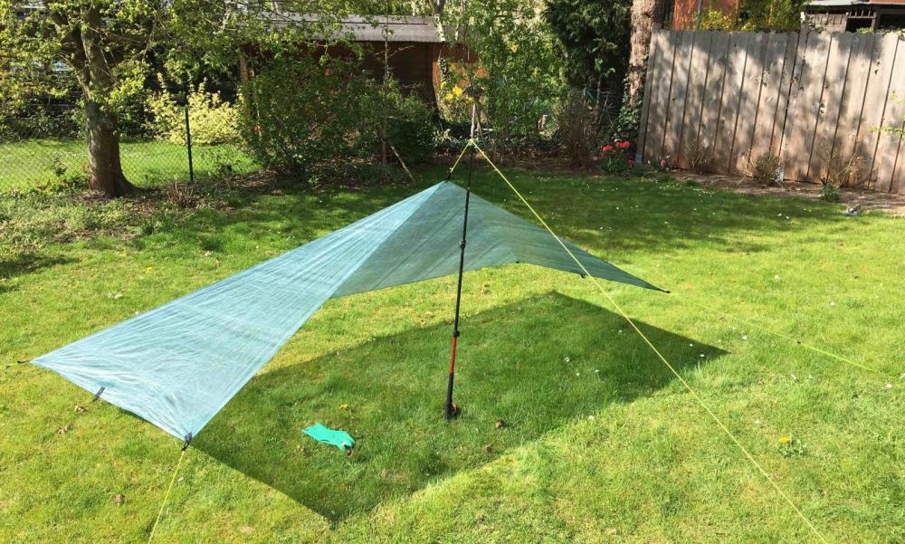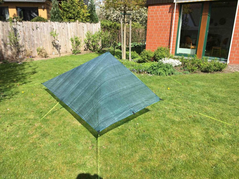 Moin, nachdem ich dieses Wochenende gezwungener Maßen meinen Ausrüstungsschrank aufgeräumt habe, biete ich das folgende Stück an: cuben tarp ca 3 *1,3 m ( eine Stoffbahn) Material ist das 25 g/qm Cuben Gewicht ca 138g Ich hab das Tarp letzten Sommer genäht, bin aber seitdem nicht dazu gekommen es zu nutzen. Da es zum Verstauben zu Schade ist biete ich es jetzt hier an. Das Tarp besteht aus einer Bahn Cuben, dadurch die etwas krumme Breite des Tarps. An den Abspannschlaufen wurde das Cuben zur Verstärkung gedoppelt und an den Firstabspannpunkten dreifach genommen (ich hoffe man kann das auf dem Foto erkennen). Die Verstärkungen wurden großflächig mit Cuben tape aufgeklebt. Der Saum des Tarps würde umgenäht. Für das Tarp hätte ich gerne die damaligen Materialkosten von 130€ plus Versand.