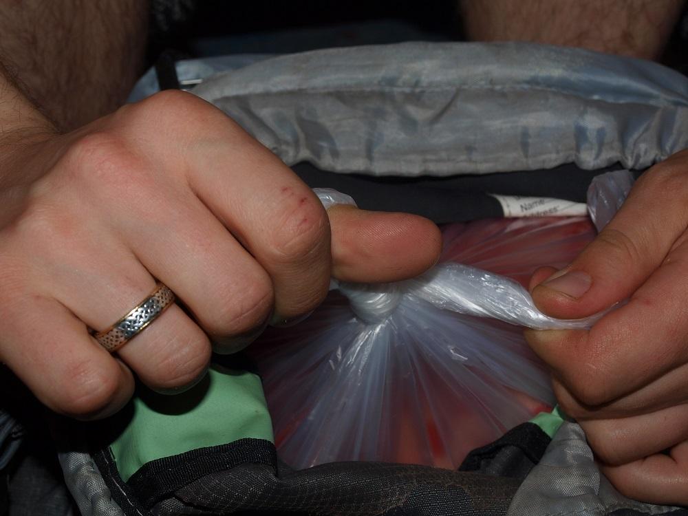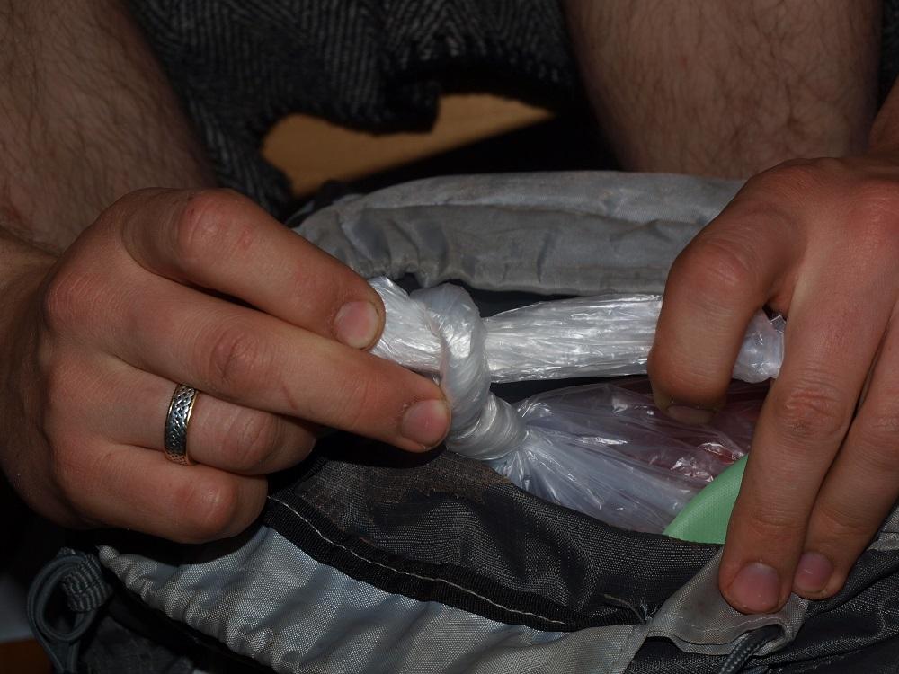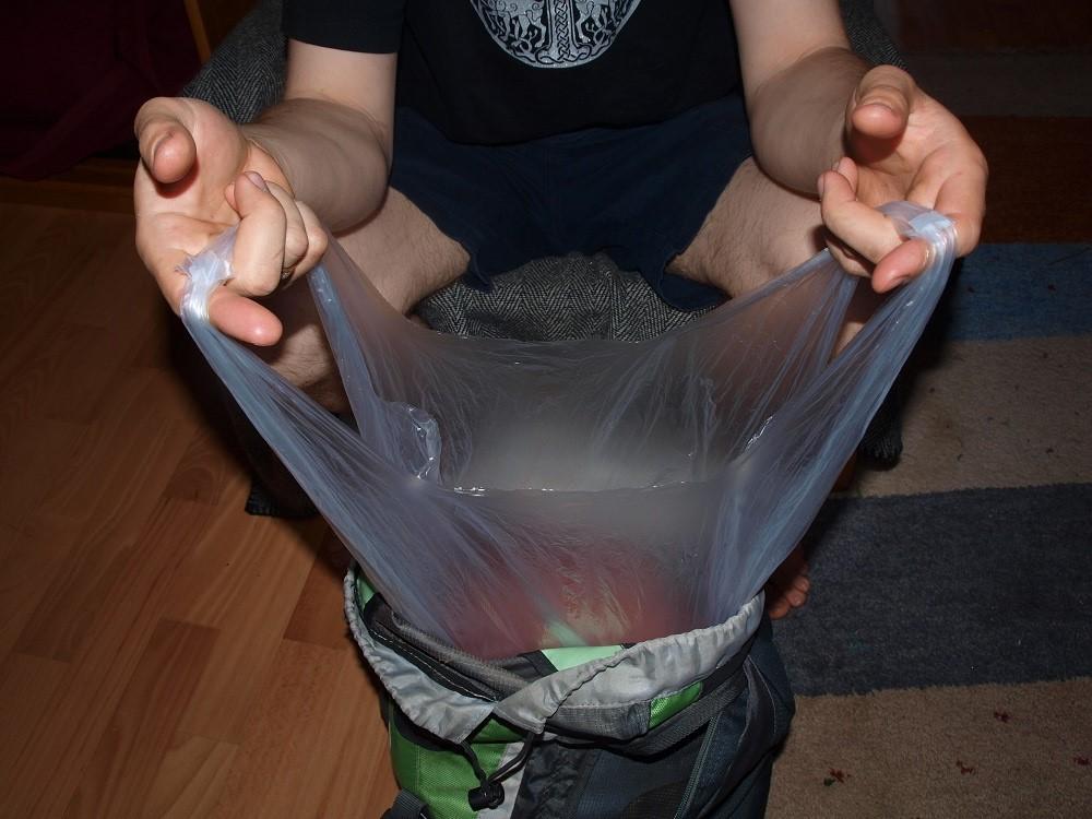 Müllbeutel werden ja gerne als Rucksackliner verwendet. Um sie jedoch relativ wasserdicht zu verschließen, muss man sie zuknoten. Bei längeren Touren und bei häufigem Knoten schließen + öffnen, kann das Material ermüden und so der Liner Schaden nehmen. Hier nun ein (Servier-)Vorschlag von mir, wie man sich seinen Müllbeutel als Rucksackliner wasserdicht verschließen kann und gleichzeitig einen Schnelllöseknoten hat: Zunächst wird der Müllsack im Rucksack gefüllt. Danach wird das überstehende Material des Müllsacks verdreht. Das ist für die Dichtigkeit nicht wichtig, erleichtert die nachfolgenden Schritte jedoch erheblich. Der verdrehte Teil des Müllsacks wird nun einmal über den Daumen der einen Hand gelegt und unter der so entstandenen Schlaufe ein paar mal herumgewickelt (2-3x, je nachdem, wie viel Material übrig ist. Aus dem jetzt noch verfügbaren Rest des Müllsacks wird eine Schlaufe geformt, die Durch die "Daumenschlaufe" hindurchgesteckt wird. Zuletzt werden nun die Wicklungen, die unter der Daumenschlaufe angebracht wurden, nach oben geschoben, sodass die durchgesteckte Schlaufe festgeklemmt wird. Fertig. Um den Knoten zu lösen, muss nur an den Griffen des Müllsacks gezogen werden (im Bild nach rechts), schon ist der Knoten gelößt und der Müllsack kann wieder geöffnet werden. ... alles nichts weltbewegendes, aber vielleicht hilft es ja dem einen oder anderen. Und es wiegt nichts... Und wie macht IHR es? Habt IHR vielleicht noch einen geheimen Geheimtipp, wie man es machen könnte?