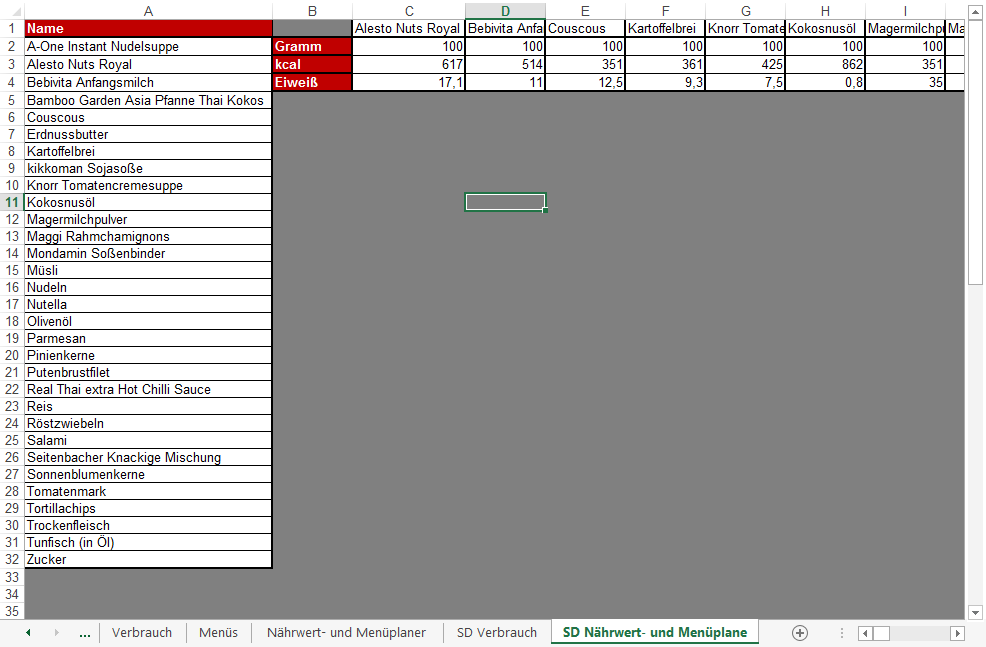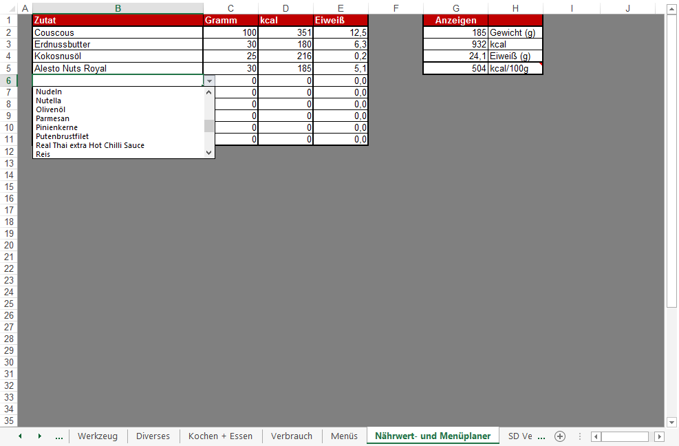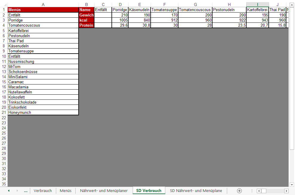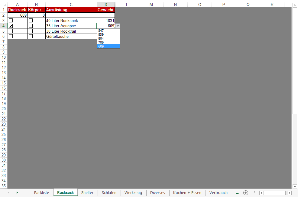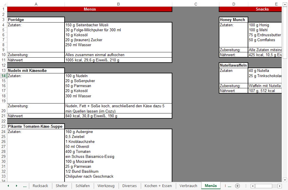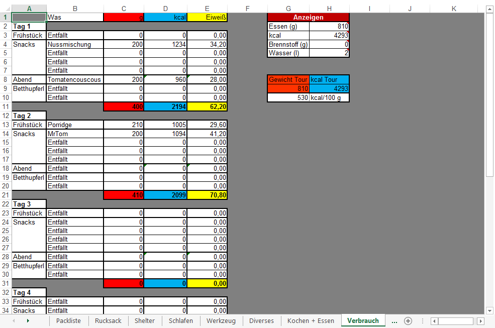Für das eigentliche Packen nutze ich die Liste auch mehr als Kontrolle, ob ich an alles gedacht habe. Grade wenn ich nur das wirklich wichtige mitnehme, stehe ich immer wieder davor und denke "Das ist ALLES? Da MUSS doch was fehlen!" Ein Blick in die Liste zeigt mir dann aber, dass alle Bereiche abgedeckt sind und dass das passt. Dass ich im Schnitt zwischen 3 und 4 kg bin, weiß ich inzwischen, daher ist das tatsächliche Gewicht für mich nachher eher "nice to know" als Ziel der Sache. Ende August werde ich mich mal an einer SUL Tour versuchen, da wird das Ganze dann wieder praktisch sein, wenn man tatsächlich mal wieder auf jedes Gramm schaut Wofür ich die Liste aber gerne nutze, ist das Essen. Besonders die Nährwerte Pro Tag sind mir persönlich wichtig. Und wenn ich neue Gerichte "entwickle", die meiner Vorgabe "max 200 g, min. 900 kcal" entsprechen müssen, ist das auch sehr praktisch, mit einem Knopfdruck mit den Gewichten zu spielen und direkt zu sehen, ob es jetzt reicht. Papierform: hm, ist mir zu wenig "dynamisch". Zu der Zeit, als ich die Liste begonnen habe, haben mich die Gewichte noch sehr interessiert. Da hatte ich dann auch keine Lust, alles von Hand zusammenzurechnen, daher habe ich mich für die digitale Form entschlossen. Ich hab mich auch noch nie so richtig mit einer analogen Form befasst. Magst Du mal nen Bild von Deiner Liste posten, wie Du sie umgesetzt hast? Der Ansatz würde mich einfach mal interessieren...