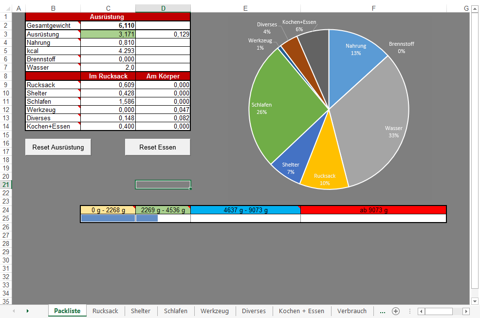 Ich gehe mal davon aus, das Ihr alle irgendeine Form von Liste führt, um Eure Ausrüstung zu organisieren. Mich interessiert, wie EURE Listen aussehen, ob sie über Sonderfunktionen verfügen und wenn ja, was sie können. Vor einiger Zeit habe ich mir mal die Arbeit gemacht und eine umfangreichere Excel-Liste geschrieben, die ich Euch heute vorstellen möchte. Sie besteht insgesamt aus 12 Seiten. Die erste Seite ist eine Übersicht, auf der die Gesamt- und Einzelgewichte dargestellt werden. In der oberen Hälfte der Tabelle sind zum einen das Gesamtgewicht (Baseweight + Verbrauch und das, was ich in den Taschen trage), allerdings auch einzeln das Baseweight (grün unterlegt), das Gewicht der Nahrung, dessen Nährwert, der Brennstoff und wie viel Liter Wasser ich mitführe. In der unteren Hälfte der Tabelle werden die einzelnen Bereiche aufgeschlüsselt. Die beiden Schaltflächen darunter setzen die Ausrüstungs- bzw. Verbrauchs-Auswahl zurück, sodass man sie nicht komplett manuell auf Null zurücksetzen muss. Das Kreisdiagramm stellt die Anteile der jeweiligen "Packbereiche" grafisch dar. Der Balken ganz unten verlängert sich proportional zum Baseweight. Die einzelnen Trekking-Bereiche (SUL, UL, L und T) sind durch Farben unterlegt. Diese Farbe ist dann automatisch die Hintergrundfarbe in der oberen Tabelle. Danach folgen sechs Seiten, in denen die Auswahl für "Rucksack", "Shelter", "Schlafen", "Werkzeug", "Diverses", "Kochen + Essen" getroffen werden kann. Wann immer man verschiedene Stückzahlen auswählen kann, bzw. die Ausrüstung modifizierbar ist (durch abnehmbare Hüftgurte o.Ä.), habe ich ein Dropdown-Menü mit den entsprechenden Gewichten angelegt, sodass man den "Zustand" der Ausrüstung bzw. die Anzahl der Erdnägel auswählen kann. Die sieht in den jewiligen Bereichen immer gleich aus, sodass ich hier nur beispielhaft die Rucksack-Seite zeige. Die Seite "Verbrauch" ist wie folgt angelegt: Insgesamt sind 6 Tage angelegt, bei denen man zum Frühstück und Abendessen jeweils per Drop-down-Menü eins der Gerichte auswählen kann, die ich im Trekking-Essen vorgestellt habe. Gewicht, Nährwert und Eiweißgehalt werden automatisch eingesetzt. Bei Snacks und Betthupferl kann man andere Dinge wie Nüsse usw. per Drop-down-Menü auswählen. Wie viel davon ich mitnehmen will, kann ich manuell eintragen. Aus dem eingetragenen Gewicht wird dann automatisch der Nährwert und Eiweißgehalt errechnet und eingetragen. Das Gewicht, der Nährwert und Eiweißgehalt werden automatisch pro Tag zusammengerechnet und danach in der Tabelle rechts unten für die ganze Tour zusammengerechnet. Hier wird dann auch der durchschnittliche Nährwert je 100g für die gesamte Tour ausgerechnet. In der Tabelle rechts oben muss manuell eingetragen werden, wie schwer das Essen ist, wie viel kcal es enthält, wie viel Brennstoff und Wasser man mitnimmt. Das habe ich aus dem Gund so gemacht, dass ich mir dann in der Übersicht im Kreisdiagramm anzeigen lassen kann, wie sich meine gesamte Ausrüstung oder eben nur das Baseweight zusammensetzt. Auf der Seite "Menüs" sind die ganzen Trekking-Gerichte, die ich mir bisher ausgedacht habe aufgeschrieben. Einfach, damit ich nicht vergesse, wie sie gehen... Danach folgt der Menüplaner. Hier sind insgesamt 10 Zeilen, in denen man per Drop-Down-Menü die einzelnen Zutaten auswählen kann. Manuell wird dann das jeweilige Gewicht eingetragen und automatisch Nährwert und Eiweißgehalt eingetragen. In der Tabelle rechts werden die ganzen Werte zusammengerechnet und der Energiegehalt/100g angegeben. Zuletzt kommen noch zwei SystemDateien für die Werte aus der "Verbrauch" und "Menüplaner"-Seite Hier sind einfach ein paar Listen angelegt, aus denen sich die Verbrauch- und Menüplaner-Seiten ihre Daten ziehen. Das ist meine Liste. Wenn sie sich jemand mal im Original anschauen will, kann er sie hier runterladen. Dann zeigt mal Eure Listen und was sie so können. Habt Ihr noch Ideen für sinnvolle Funktionen, die man einbauen könnte?