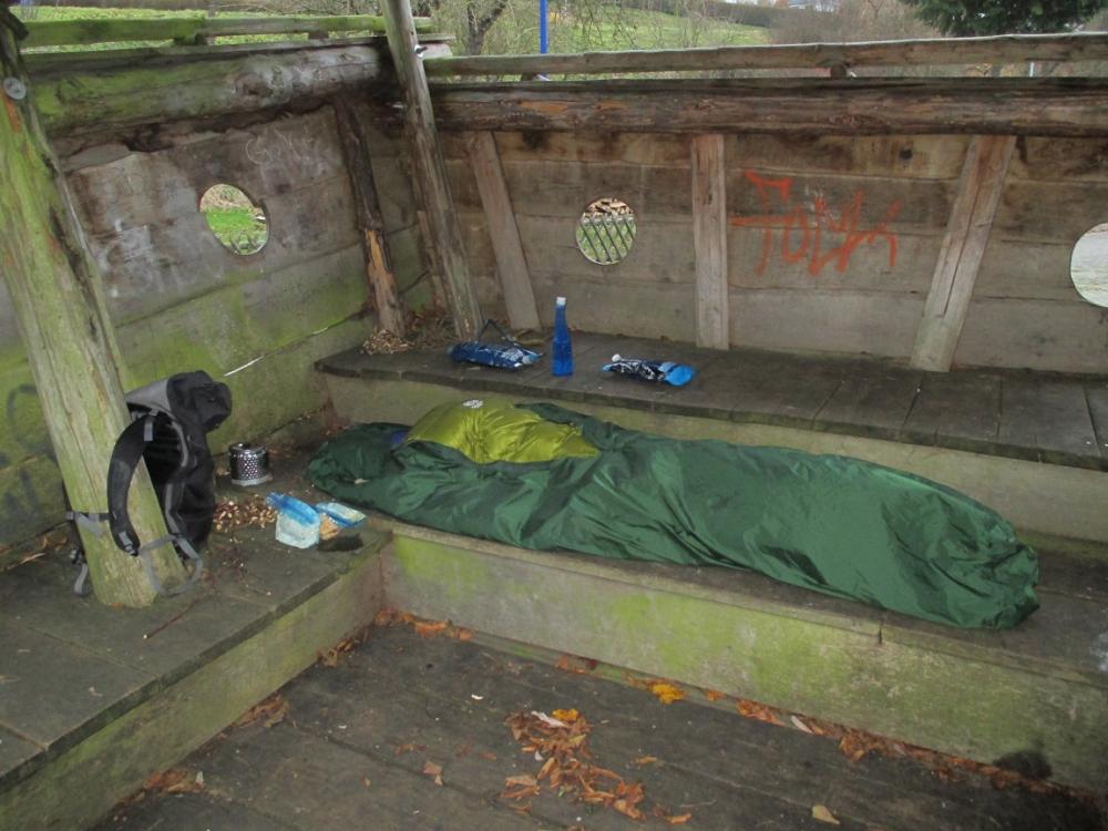 hehe, wo stehen denn Deiner Meinung nach Schutzhütten? Vielleicht sprechen wir von verschiedenen Dingen, wenn wir von Schutzhütten sprechen. Ich meine da etwas, das ein Dach und in der Regel 3, wenn man Glück hat, sogar 4 Wände hat. Also quasi ne kleine Bretterbude. Die eine war eher nen Carport und bot halt Schutz vor Regen. Geschlossen war keine und RICHTIG windstill war es auch in keiner. Sprechen wir da von der selben Art Schutzhütte oder was stellst Du Dir darunter vor? EDIT: 1. Ich hab mich beim Setup geirrt, am Kellerwaldsteig hatte ich den Tyvek-Bivi noch nicht, da war noch einer von WäFo. 2. @Dani: Das sind leider die einzigen Bilder, die ich von einer der "Schutzhütten" habe: Und so kalt war es dann am Morgen: Sowas meine ich, wenn ich von Schutzhütten spreche -