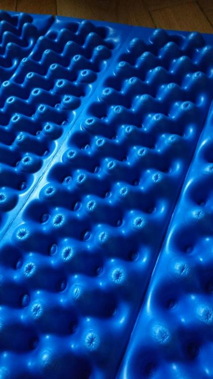Versuch 2. Nacht auf der Matte mit dem Trick von Wilbo, eine zweite dünne Matte obenauf: deutlich besser, mehr oder minder 3h durchgeschlafen, danach aus Faulheit und Bequemlichkeit Umzug in's Bett. In etwa vergleichbar mit einer NeoAir, auf der ich ehrlicherweise auch selten durchschlafe. Als dünne Matte habe ich jetzt nicht die oben angesprochene 4mm Evazote benutzt, sondern eine billige Gymnastikmatte von Decathlon genommen. Die ist 6,5mm dick, aus (laut Produktbeschreibung Decathlon) geschäumtem Polyethylen. Genommen hab ich die, weil sie etwas steifer ist. Mit ca 150g bei 140x50cm wäre die sogar fast tourtauglich. Was auffällt: schon nach zwei halben Nächten deutliche Gebrauchsspuren bei den Knubbeln, potentiell eine plastische Verformung, sie flachen sich schon ab (siehe Bild unten). Ob die Verformung elastisch ist, also sich wieder zurück entwickelt, werde ich beobachten. Aber bei einem Thruhike hätte die Matte ja auch keine Zeit, sich innerhalb mehrerer Tage zurück zu verformen, weil sie jede Nacht belastet wird. In der dünnen Matte oben auf zeichnen sich die Knubbel auch schon ab, die Last auf die Knubbel und somit die Spürbarkeit auf der Haut ist also keine Einbildung eines UL-Prinzen auf Erbse.
