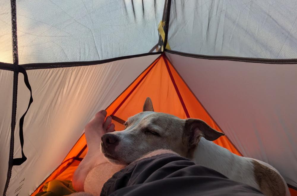 Der kleine ist 14 kg schwer und passt knapp aber komfortabel in mein 1 Mann Zelt. Er schläft da auf meiner Sitzmatte und wenn es frischer wird, kommt er halb mit in den Schlafsack/Quillt. Ich wandere derzeit noch im Schnitt 5-6 Tage. Ja Hundefutter ist ein Thema, habe es bei der letzten Tour mit Solar-Barf probiert. Das hat er die ersten 3 Tage geliebt, aber i-wann war ihm das wohl zu viel des guten. Denke für die nächste Tour an ein Futtermix von 2-3 Optionen, nur was genau ist mir noch ein Rätsel.