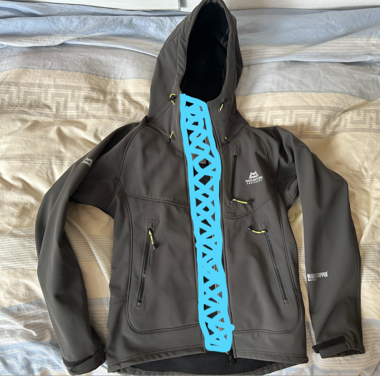 vielleicht hat jemand eine gute Idee wie ich meine Jacke "umschneidern" kann. Das gute Stück (Neupreis lag bei ca. 350 EUR) liegt mir in Größe S vor und ist leider um den Bauch herum zu eng. Ärmel passen, auch der Rest ist von der Länge in Ordung. Hab mir also überlegt ein Stück zu schneidern, das zwischen die zweit Teile des Reisverschluss (YKK®) passt und auch vom Reisverschluss geschlossen wird. Zum Material: Auf dem Etikett steht: Außen: 85% Polyamidschicht 15% Elasthan mit ePTFE membran verbunden. Hat jemand Erfahrung mit so was? Hier eine grobe Skizze, zu meiner ersten Idee. Das blau eingezeichnete entspricht dem neuen Stück .... das schreibt der Hersteller: Die Vulcan Jacke für Herren von Mountain Equipment ist ein Allroundtalent fürs ganze Jahr. Die Gore® Windstopper® Jacke ist absolut winddicht und wasserabweisend und dabei stark atmungsaktiv. Der Elasthan-Anteil sorgt für bestmögliche Bewegungsfreiheit, während die angeraute Innenfläche und die Flachnähte für ein angenehmes Tragegefühl sorgen. Auch wenn der selbstgebastelte Einsatz nicht wasserdicht ist, dann wäre mir das auch egal, denn bei Regen kommt sowieso ne andere Jacke drüber.. Bin um jeden sinnvollen Vorschlag dankbar :-)