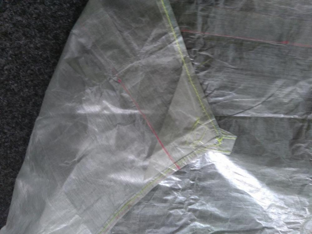 Diesmal ein Cuben Tarp in Drachenform, es ist unten 140 cm breit, oben 200 cm breit und hat eine Länge von 230 cm. Da für die Mitte eine komplette Cubenbreite gewählt wurde, kommt es ohne Mittelnaht aus. Um trotzdem auf eine angenehme Breite zu kommen, wurden Seitenstücke angeklebt (cubentape). Verwendet wurde Dyneema composite 18g/qm. Da bei dem Projekt gleich zwei Tarps angefertigt wurden, rechnete sich das Ganze, da vier Seitenteile aus einer Bahn gefertigt wurden. Also insgesamt 6,60 meter cuben, Reste sind auch noch genügend vorhanden. Das Ganze wurde dann einmal mit der Nähmaschine umsäumt und für die Bänder Cubenstreifen mit dem Rollsaumfuss gesäumt (überhaupt meine neue Vorgehensweise für Kappnähte ). Die Streifen wurden dann auf Segeltape genäht und diese dann auf die Ecken als Abspannung geklebt. Das Tarp wurde also nicht durchstochen. Insgesamt passen (wenn es mit 20 cm Abstand vom Boden abgespannt wurde) 2 Leute mit 50 ziger Isomatten gut rein. Ach so, das Wichtigste: 94 Gramm...