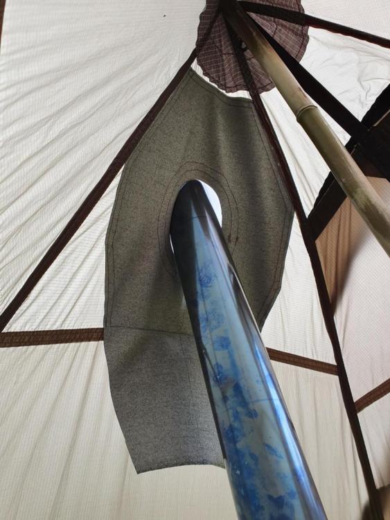 Eurem Rat folgend habe ich den Ofenrohrdurchlass so weit wie möglich an der Spitze eingenäht. Es sind jetzt geschätzte 130cm ofenrohrverlauf im Zelt bis zum durchlass.