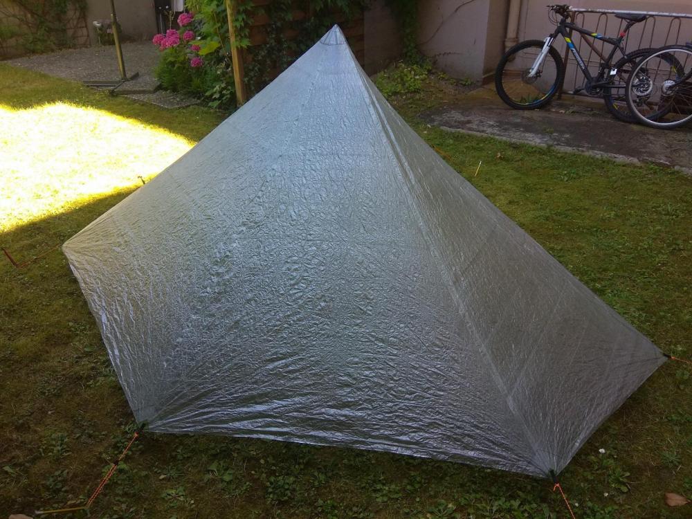 Für meinen anstehenden GR11 musste eine neue Behausung her. Das Konzept vom Hexamid finde ich eigentlich ziemlich cool, da man sich aufrecht hinsetzen kann. Ich glaube ich war etwa einer der letzten, die noch bei Zpacks Cuben bestellen konnten Ich habe insgesamt 4 yds Cuben verwendet. Ich habe mich in erster Linie für das Kleben entschieden, nur die Abspannpunkte und oben sind mit nähten verstärkt. Oben habe ich ein Stück Cuben Hybrid verwendet (geklebt und genäht) Hier erstmal mein Schnittmuster: Leider bin ich nicht so begabt im Schneiden, deswegen ist das Ergebnis etwas schief geworden und ich musste noch mal nachbessern. Vor allem hatte ich unterschätzt, wie stark die vorderen Flügel abgewinkelt werden müssen, da musste ich die Naht noch mal komplett auftrennen, ein großes Stück abschneiden und neu verkleben (also das ganz rechte Stück) Ein ganz kleines bisschen fehlt immernoch, dass man das Zelt perfekt abspannen kann an den vorderen Flügeln, aber soweit bin ich jetzt eigentlich zufrieden mit dem Ergebnis. Das wichtigste: Gewicht: 130g (mit Schnüren) Wie es sich in der Praxis macht, werde ich dann im September berichten können Das Ergebnis sieht jetzt so aus: