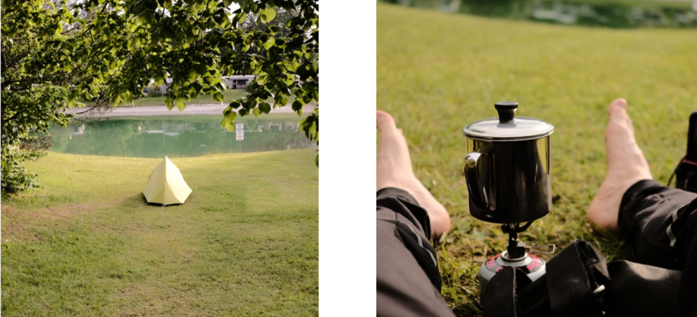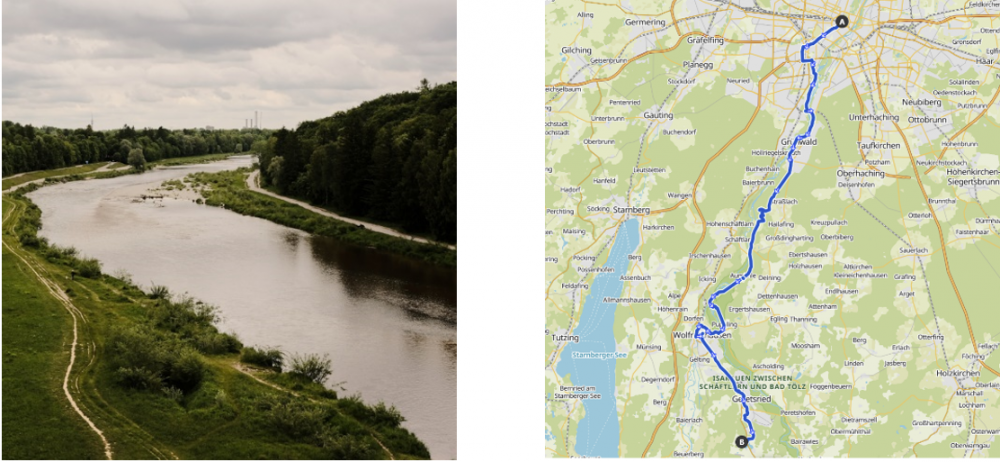 Tag 1 (7. Juni 2021.) München-Königsdorf, 55 km Da ich den ersten Tag gemütlich beginnen wollte, habe ich erst mal ausgeschlafen, gegen Mittag ging es dann gut ausgeruht vom Marienplatz in München los. Erst ein kurzes Stück durch die Innenstadt und dann immer an der Isar entlang. Die Strecke war ein guter Mix aus kleinen Straßen und ausgedehnten Schotterabschnitten durch Waldlandschaften. Das Wetter war sehr wechselhaft, dunkle Regenwolken wechselten sich regelmäßig mit strahlendem Sonnenschein ab. Bei Wolfratshausen machte ich einen Abstecher auf einen par Single Trails, es waren überwiegend schlammige Waldwege direkt am Flussufer. Am Nachmittag fand ich bei Königsdorf einen kleinen Campingplatz der noch reichlich Platz direkt an einem Seeufer hatte.