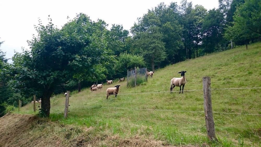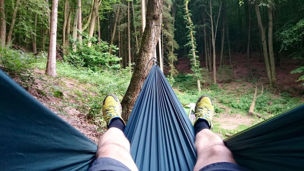 Anfang Juli war es nun soweit: Ich, meine Frau B. und mein Sohn M. (10 Jahre) brachen zu einer kurzen Trekkingtour im Pfälzer Wald auf. Meine Gelegenheit die beiden an meiner Begeisterung für UL-Trekking teilhaben zu lassen und vielleicht auch ebenfalls anzustecken. In den Vor-Eltern-Tagen hatte ich zusammen mit B. viele Urlaube mit Radreisen und Zelten verbracht und nun wollten wir uns als Familie an das Experiment Trekking wagen. Leider bin ich literarisch nicht sehr begabt, möchte mich aber dennoch an einem kleinen Reisebericht versuchen. Früh war schon klar: So UL wird die Aktion nicht. Für einige Tage Versuchswandern wollte und konnte ich nicht für alle drei eine komplette UL-Ausstattung anschaffen. Würde das Trekking bei Frau und Kind nicht auf Gegenliebe stoßen, wäre das eine große Fehlinvestition gewesen. So war erstmal das 3,2kg Zelt gesetzt, auch die schweren Schlafsäcke von Frau und Kind mussten mit. Daraus folgte, dass auch die MYOG-UL-Rucksäcke daheim bleiben würden und mein Exos58 sowie der alte Trekkingrucksack meiner Frau Dienst tun würden. Mein Sohn nahm einfach seinen 800g-Deuter-Rucksack mit 20l Fassungsvermögen. Soweit so Kompromiss. Beim Rest der Ausstattung versuchte ich aber die UL-Prinzipien anzuwenden und so wurde für jeden ein leichtes Kleidungsset mit Hilfe von Decathlon ergänzt. Die Küche wurde auf Freezerbag-Kochen reduziert und auch der Rest vom Ausstattungsgeraffel wie Isomatten, Badbeutel, etc. wurden im Vorfeld soweit möglich reduziert. Meine Gewichtsparbemühungen riefen bei meiner Frau unverständliches Kopfschütteln hervor und die am Ende beim Packen von ihr herbeigeholten Gegenstände kontakarierten meine Bemühungen etwas: Schwere Brillen-Cases, Ledergeldbörse, Hängematte, usw. Dabei müsste sie nach ihrem Bandscheibenvorfall und den kaputten Bändern rund um die Sprunggelenke besonders großes Interesse am Gewichtsparen haben... So kamen am Ende recht schwere, aber noch gut tragbare Packs zusammen. Gewogen habe ich sie lieber nicht Am 3.7. gings dann also los. Wir hatten uns vier der Trekkingplätze im Pfälzer Wald gebucht und eine grobe Route überlegt. Schön kurze Etappen, weil ich die Höhenmeter schwer einschätzen konnte und Junior nicht überfordern wollte. Mich natürlich auch nicht, mit dem schweren Rucksack plus 10kg Bürospeck zu viel auf den Rippen. Wir stellten das Auto am frühen Nachmittag in Dernbach ab und machten uns Richtung Annweiler zum Platz Nr. 3 auf. Los geht´s! Wanderer werden in dieser Gegend kritisch beäugt Die Höhenunterschiede waren für uns Flachlandtiroler nicht ohne und ich war froh, die Etappenlänge sehr kurz gewählt zu haben. Viele Wege waren Bach-artig ausgespült oder matschig, die vorangegangenen starken Regenfälle in Süddeutschland waren noch deutlich zu spüren. MATSCH! Und wegen der reichlich vorhandenen Mücken mussten wir nach wenigen Kilometern eine Autan-Pause einlegen. Praktischer Flaschenhalter, auch für Pausen. Burg Trifels ist in der Ferne schon erkennbar. Auf erstmal unspektakulären Wegen ging es dann nach und durch Annweiler. Dann eine kleine Futterpause im Gras, bevor es in den Anstieg zum Platz 3 ging. Das Essen war lecker, die Pause schön, aber vermutlich hier haben wir uns mit einer unheimlich unangenehmen Insektengattung „infiziert“, die in Norddeutschland nicht so verbreitet ist: Herbstgrasmilbenlarven. Sie blieben lange unentdeckt, doch später mehr dazu. Mampf. Schließlich fanden wir dank GPS im Handy den versteckten Platz ganz gut und so begann für M. nach dem langweiligen Rumgelatsche der spannende Teil des Tages: Lagerfeuer machen! B. und M. sammelten erstmal Holz im Wald, bevor es dazu zu dunkel wurde. Ich baute das Zelt auf und holte dann Wasser aus dem nahe gelegenen Bächlein. Der Platz ist schön am Rande eines länglichen Tales gelegen, großzügig bemessen und hat zwei Feuerstellen. Sobald dann das Feuer brannte, gab es Freezerbag-Fertignahrung. Das für den Abend gewählte Gulasch mit Kartoffelbrei war sogar recht lecker Das stille Örtchen. Am nächsten Morgen dann der erste Gruß von den Herbstgrasmilben. B.: „Reichst du mal den Azaronstift rüber, ich habe hier am Arm ganz viele Mückenstiche“. Merkwürdig, denn dank Autan, einem praktisch mückenfreien Lagerplatz und mückendichtem Innenzelt waren Mückenstiche sehr unwarscheinlich. Egal, Aufbruch nach Morgentoilette, Frühstück, Lager abbauen und Packen zum Platz Nr. 4. Wir kommen spät los, haben aber auch nicht viele Kilometer vor uns. Dafür viele Höhenmeter, wie sich bald rausstellt. Immer schön nach oben... Über einen Berg mit vielen Felsformationen, Ruinen und Burgen (u.a. Burg Trifels) ging es wieder runter nach Annweiler, wo wir noch Wasser eingekauft, die Pfälzer Sandsteinarchitektur bewundert haben und dann, wie kann es anders sein, Berg hoch zum nächsten Trekkingplatz liefen. Coole Sandsteinfelsen Burg Trifels, diesmal deutlich näher. Puh! Impression aus Annweiler. Weiter über Stock und Stein Es war dann etwa 18 Uhr, als wir k.o. bei schwüler Wärme den Platz gefunden haben. Diesmal recht steil am Waldhang gelegen, aber mit ebenen Bereichen für die Zelte. B. hängt erstmal ihre Hängematte in die Bäume und entspannt ihren schmerzenden Rücken, während M. sich ums Feuer kümmert. Ich darf mich mal wieder ums Zelt kümmern, dann gehen M. und ich die angeblich in der Nähe befindliche Quelle suchen. Hierfür haben wir leider keine Koordinaten und so suchen wir erstmal in der falschen Richtung. Dann in der anderen möglichen Richtung, auch nix. Mist. Aber dann schlägt sich M. am Rande einer Kuhweide in die Büsche und siehe da, er hatte den richtigen Riecher. Eine kleine Quelle zwischen großen Steinen am Berghang hinter dem Zaun der Kuhweide. Keinen Meter unterhalb der Quelle waren dann auch schon die Ausscheidungen der Kühe zu bewundern… Das Befüllen unserer Platypus war zwischen den Steinen recht schwierig, dann machten uns zurück bergauf zum Lagerplatz. In