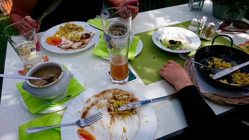 Fortsetzung: Zähneputzen im Camp Nr. 5 Blick in die Küche Am nächsten Morgen geht’s uns wieder ganz gut, nach dem Frühstück sind wir recht fit. Der Blick auf die Karte verrät aber, dass die Strecke zu Platz Nr. 6 wieder nur mit vielen Höhenmetern, etwa so wie am vergangenen Tag, zu erreichen ist. Das trauen wir uns aber nicht so recht zu, hinzu kommt der schlechte Schlaf durch die juckenden Stiche und der Akku vom MP3-Player ist leer… Also beschließt der Familienrat die Tour abzukürzen und zum Auto nach Dernbach zu wandern. Hätten wir noch einen Ruhetag am Platz 5 verbringen können, wäre die Entscheidung anders ausgefallen. Aber leider muss man nach einer Nacht den Platz wechseln. Wir packen unseren Kram und gehen den Weg zurück runter nach Eußerthal. Bergabgehen ätzt echt mehr als bergauf. Morgens sieht die Welt anders aus Abkühlung im Bach - das tut gut! Zwischen Eußerthal und Dernbach liegt dann nur noch ein moderater Hügel, so dass wir ohne Zwischenfälle mittags das Auto erreichen. Genau die richtige Zeit, um die Pfälzer Gastronomie zu testen! Wir finden im Ort eine sympathische Gaststätte und lassen die Tour bei lecker Wildgulasch und Spätzle ausklingen. Die eheliche Unterhaltung besteht inzwischen zu etwa 40% aus „Na, juckts? Nicht kratzen!“ Erst die Recherche daheim klärt uns darüber auf, dass wir an diesen tollen Herbstgrasmilbenlarvenstichen leiden und dass das Jucken noch so 1-2 Wochen andauern wird. Na toll! Zurück nach Dernbach Lecker Pfälzer Essen Fazit: · Allen hat es eigentlich Spaß gemacht, meine Frau kann sich nun auch längere Touren vorstellen (z.B. den E6) · Nur Laufen ist für Kinder langweilig, besonders als Einzelkind. Stimmt die Motivation, z.B. durch einen MP3-Player, sind ungeahnte Leistungen möglich · Das Gewicht muss weiter reduziert werden, besonders an Zelt und Schlafsäcken, aber auch am eigenen Bauch · Herbstgrasmilbenlarven sind die Pest. Ein echter Spaßkiller. Unsere Hosen waren mit Nobite behandelt, die Haut mit Autan, hat alles nix gebracht. Und Azaron hilft nicht gegen das Jucken. So bald werde ich mich nicht wieder unüberlegt auf eine Wiese setzen… · Nur eine Handykamera dabei zu haben, ist auch irgendwie doof -