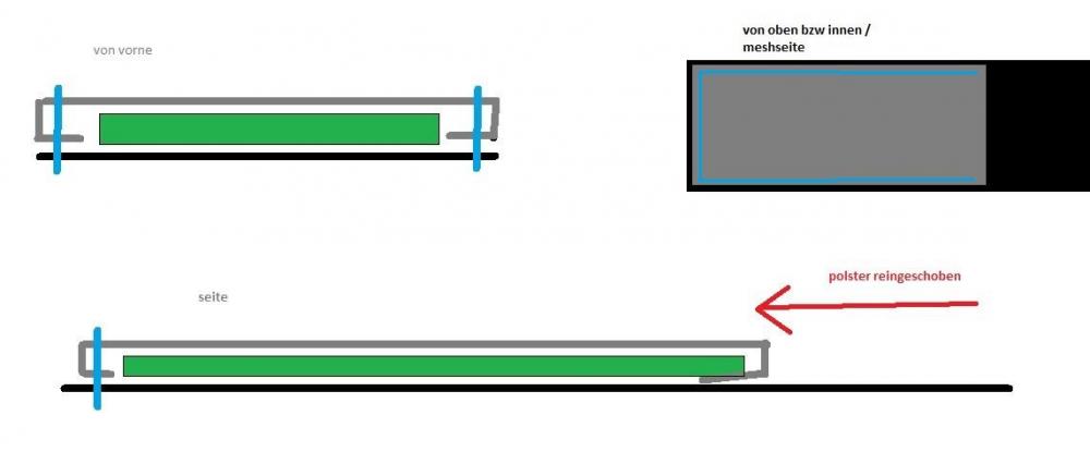 ne nach ein paar Jahren nimmt das schon ab beim Schaumstoff, ist halt die Frage für wie ewig das halten soll. Aber da fällt mir der ÜLA hüftgurt ein. Da ist mir mal was praktisches aufgefallen: Das Polster ist da austauschbar. die haben das Mesh einfach umgelegt und dahinter ist dann auf jeder Seite ein polster reingesteckt. hab mal ne skizze gebaut wie ich mir das in deinem fall vorstelle. ( das polster wäre dann variabel bzw kann man auch einfach weglassen ) schwarz gurt, grau mesh, grün polster und blau Naht. -
