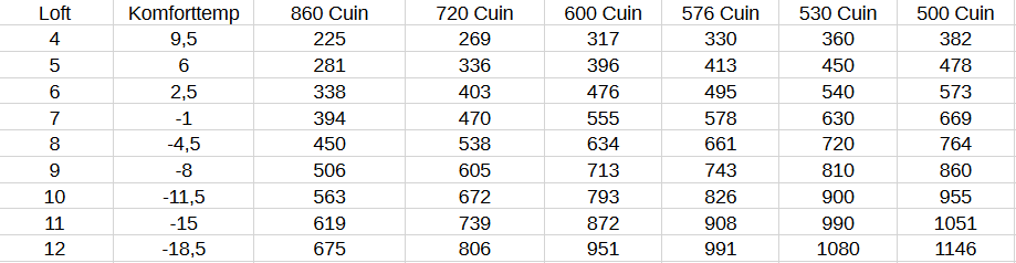 Aah ok. Ja das passt dann so, weil die Mengen mit leichtem Overfill berechnet waren. Dass die Fußbox nicht am Umfang verliert ist klar. Meinte damit ja nur, dass ich das bei 100 Breite belasse und nicht noch enger mache, damit es nicht zu eng wird Ich Größenangaben beziehen sich doch immer auf den Zuschnitt und nicht den gefüllten Quilt. Jeder gibt 2 Meter an - was bei 4 Laufmetern ja hinkommt. Wenn du die 135 cm Breite inkl. Füllung meintest, dann wären 145-150 cm nötig, da ja durch den 6 cm Loft + Saum ja paar cm weg fallen. Wie die Cuin im Labor gemessen werden ist mir schon klar. Ich habe aber bereits ermittelte Werte für bestimmte Cuin Werte genommen und das entsprechend umgerechnet. So grob reicht es mir ja. Wenn im Labur z.B. 700 Cuin ermittelt werden und x Gramm bei x Litern ausgerechnet werden, dann kann ich diese Werte für unbekannte Daunen nehmen und bei einer bekannter Behältergröße die Liter und das Gewicht der Daunen die rein pasten auf Cuin umrechnen. Hier die Tabelle - die Werte für 860 und 720 Cuin habe ich von einer Seite, die ich gerade nicht finde. Dort waren die Werte für ein bestimmtes Volumen bzw. Loft umgerechnet. Standardquilt von 200x150/100. Diese Werte dann auf andere Loftgrößen und Cuinwerte umgerechnet: -