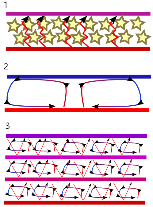 @zwiebel: ich dachte auch erst an Stützen, die direkt mit verbaut werden können..ist aber nichts leichtes da, was funktionieren dürfte. Federbandstahl hört sich da leider nicht leicht an :/ Das einfachste was mir einfiel ist, dass man Ösen im Innenzelt anbringt + das ganze dann über Leine + Gummileine anbringt. ist so, als würde man Trekkingstöcke für Zelt/Tarpaufbau benutzen @Martin: die Dicke müsste man noch heraus finden, genau Wobei ich nicht laube, dass es soo kritisch sein wird. Hier gehts ja nur um 2-3°C Temperaturunterschied unterhalb der Zellen - und das Material selbst ist Isolierend + Wärmereflektierend. Es dauert also, bis die Nachbarzellen sich aufgewärmt haben. Winddicht muss jeder für sich entscheiden - bei einemTarp natürlich wichtig. Ich gehe von einem normalen, zweiwandigem Zelt aus. Das Material ist bedingt Winddurchlässig, weshalb es naürlich bei direkter Windeinwirkung schnell auskühlen kann. Das 30 g/m² Material könnte hier aber auch schon ausreichen - habe da noch keine Pustetest durchgeführt. Habe hier noch mal schnell ne Grafik zur verdeutlichung gemacht: 1. Daunenschlafsack. Wärme "quält" sich durch die Daunen bzw. in diesen eingeschlossene Luft 2. Daunenschlafsack ohne Daunen - bei selber Dicke Da Stoffe sehr wärmeleitfähig, geht die Wärme auch schnell verloren. Hier kann ich mir schon eher "bewegte Luft" vorstellen, da auf die paar cm die Luft ja einen Unterschied von >30° hat. D.h. die Luft kommt unten durch den Stoff mit Körpertemperatur an und wir oben am Stoff auf Außentemperatur abgekühlt, wodurch diese wieder "fällt" (=Luftbewegung) 3. Hier mal nur mit vier Vlies-Schichten ohne Zwischenkammern aufgebaut: Luftbewegung und IR-Reflexion (Aluminiumbeschichtung) Großer Unterschied zum Gebäude: dort gibts eine Luftbewegung zwischen "unten und oben" - z.B. in einer doppelt verglasten Scheibe, oder einem Hohlraum in der Wand. Hier geht die warme Luft nach oben - d.h. nur innerhalb von wenigen mm bis cm Dämmschicht "Luft" - und zwar zur "warmen" nachbarkammer und nicht der kalten Decke. Diese kommt erst nach mehreren Kammern. Aufbau Nr. 3 ist eher mit einer Deckendämmung aus mehreren Lagen dünnes Styropor mit jeweils einer Luftschicht dazwischen zu vergleichen. Das Styropor lässt die Wärme nicht direkt durch, weshalb sich die Schichten darüber nicht so schnell erwärmen bzw. die unteren von diesen nicht so schnell abgekühlt werden (=höhere Temperatur bzw. Dämmwirkung) -