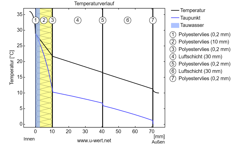 Hier mal der Temperaturverlauf innerhalb der Dämmschichten vom letzten Aufbau (Vlies -> 10 mm Polyestervlies -> Vlies -> 30mm Luft -> Vlies -> 30mm Luft -> Vlies) - ein mal mit und ein mal ohne die Luft dazwischen: -