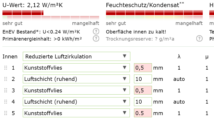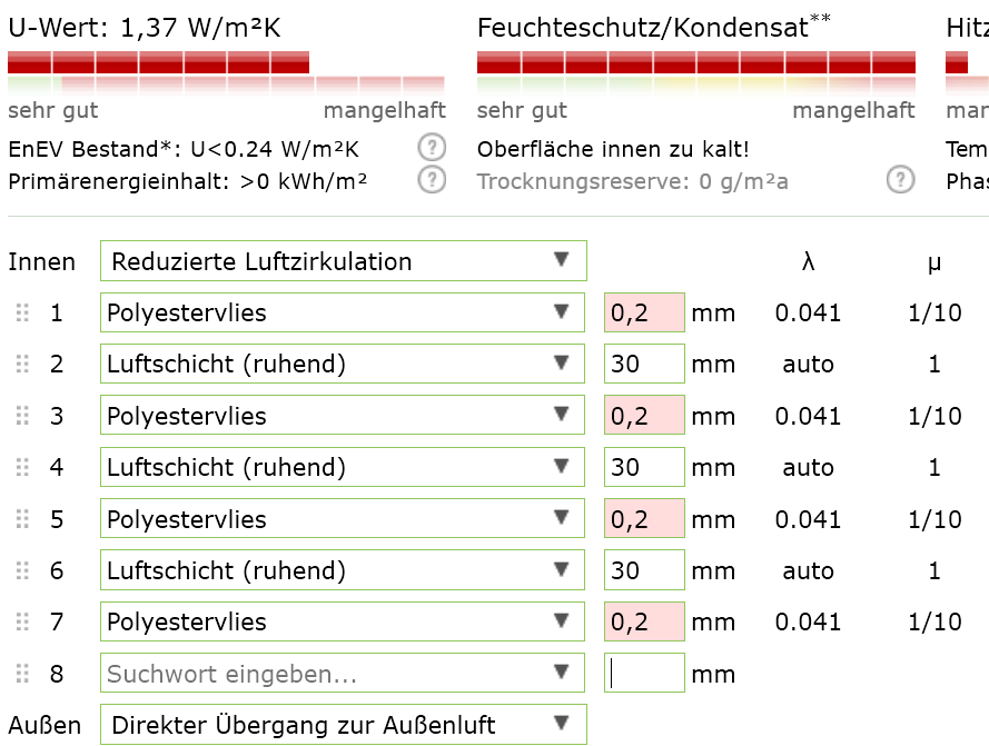 Hier mal paar Simulationen - ab einer Luftschicht von 30mm zwischen den Vliesschichten verändert sich der U-Wert nicht mehr. Dazu eine 10 cm dicke Vliessschicht zwischen 0,1mm Nylon als Vergleich: Eine Zwischenschicht Vlies mit je 10 mm Luft zwischen den Schichten: Eine Schicht Vlies mit je 30 mm Luft dazwichen: 10 cm Dicker Vlies-Schlafsack: Ausgangswerte: Innen: 36°C, 80% rel. Luftfeuchte Außen: 5°C, 50% rel. Luftfeuchte Ergebnis zu 1: Oberflächentemperatur der Innenseite: 25,0 °C Oberflächentemperatur der Außenseite: 11,8 °C Ergebnis zu 2: Oberflächentemperatur der Innenseite: 26,0 °C Oberflächentemperatur der Außenseite: 11,6 °C Ergebnis zu 3: Oberflächentemperatur der Innenseite: 19,4 °C Oberflächentemperatur der Außenseite: 12,7 °C Reduziere ich jetzt im Aufbau 1 und 2 die Luftschicht auf 0 mm = drei Vliesschichten direkt liegend, so kommt ein U-Wert von 5,83 W/m²K zustande. Die Isolation ist dahin: Oberflächentemperatur der Innenseite: 13,7 °C Oberflächentemperatur der Außenseite: 13,6 °C Mit einer weiteren Schicht Vlies dazwischen (insg. 4 x Vlies + 3 x 30mm Luft) ergibt sich ein U-Wert von 1,4 W/m²K: Oberflächentemperatur der Innenseite: 28,2 °C Oberflächentemperatur der Außenseite: 11,2 °C Finde leider keine U-Werte für z.B. Climashield, dass ich damit mal was berechnen könnte. Edit: Polyestervlies soll einen U-Wert um 0,04 haben. Eine 2 cm Dicke Schicht von diesem mit zwei 0,1 mm Stoffschichten ergibt einen U-Wert von 1,52: Oberflächentemperatur der Innenseite: 27,6 °C Oberflächentemperatur der Außenseite: 11,3 °C Edit 2: Mit dem Korrigierten Wert für das Vlies (U-Wert für die Vliesschichten übernommen) ergibt sich bei dem 4-schichtigem Aufbau ein U-Wert von 1,37 (1,40 vorher) bei nur noch 0,2 mm Vlies statt 0,5mm (bei dem "Kunststoffvlies war 0,5mm als Minimum vorgegeben). Hier merkt man also, dass das Material zwischen den Luftschichten fast keine Rolle spielt: Oberflächentemperatur der Innenseite: 28,6 °C Oberflächentemperatur der Außenseite: 11,2 °C Komm jetzt statt der ersten (innersten) Schicht Luft 10 mm Polyesterholhlfasern rein, wie es es ja vor hatte, kommt man auf einen U-Wert von 1,22: Oberflächentemperatur der Innenseite: 29,1 °C Oberflächentemperatur der Außenseite: 11,1 °C Lässt man die beiden Luftschichten auf 0mm zusammen fallen, steigt der U-Wert auf 2,16: Oberflächentemperatur der Innenseite: 24,8 °C Oberflächentemperatur der Außenseite: 11,8 °C -