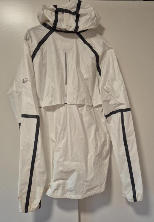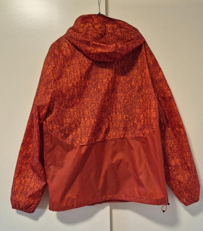 Die Jacke war auf 3 Touren dabei und wurde auch bei Dauerregen eingesetzt. Sie lässt sich in der eigenen Brusttasche verstauen. Da sie seit längerem ohne Verwendung im Schrank hängt darf sie gehen. Die Jacke ist unbeschädigt weist jedoch die im Foto dargestellten Flecken auf (keine Ahnung was das ist oder wo es herkommt). Zudem habe ich, innenseitig im Rückenbreich, die Lüftungsschlitze gegen herunterfalten mit Spinnakertape gesichert (Die vorhandene Abnähung ist falsch/unzureichend angebracht). Sie wiegt laut meiner Küchenwaage 195 g. 70,- EUR ohne Versand Privatverkauf, keine Gewährleistung, keine Rücknahme.