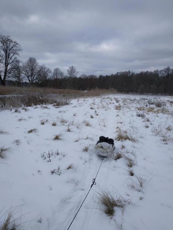 Vergiss die Teichfolie, die wird dir zerreißen (auf Eis ist das wie auf einer Schotterpiste). Es ist auch wichtig, dass du unten eine ebene und glatte Gleitfläche hast. Wenn der Boden/die Gleitfläche unförmig ist, dann erhöht das erheblich die Reibung und das Ding läuft nicht stabil und wird dir ständig umkippen. Ich würde auch eine 1mm UHMW-Platte nehmen. Für die, voraussichtlich einmaligen, fünf Tage reicht auch HDPE (ebenfalls 1mm). Die Platte würde ich wie hier falten (durch ritzen): https://www.airframesalaska.com/Backcountry-Flex-Sled-Large-p/nswflexl.htm Kufen und Querstreben braucht es eigentlich nicht. Erfahrungsgemäß kann man sagen, dass "Länge läuft". Also eher schmal, lang und den Schwerpunkt unten. Bei Schneeschuhen weiß ich es nicht, aber bei Ski sollte die Gleitfläche max. 25cm breit sein, damit sie schön in der Spur läuft. Es ist auch wichtig, dass die Tasche nicht über den Rand der "Pulka" hängt und im Schnee schleift. Zum Ziehen fand ich bis jetzt von allen Variationen diese am besten: https://www.outdoorseiten.net/vb5/forum/outdooraktivitäten/wintertouren/87134-pulka-ohne-gestänge-richtige-seillänge-usw (also wie im Eingangspost) Da würde ich dann eine Tasche mit Reißverschluss drauf setzen. Hierfür würde ich einfach so eine Ikeatasche nehmen und fertig: https://www.ikea.com/de/de/p/frakta-tasche-fuer-karre-blau-90149148/ Zusätzlich noch einen Rucksack für das Fotozeuchs. Das Ganze sieht dann so aus (hier mit Rucksack da nur Wochenendtour):