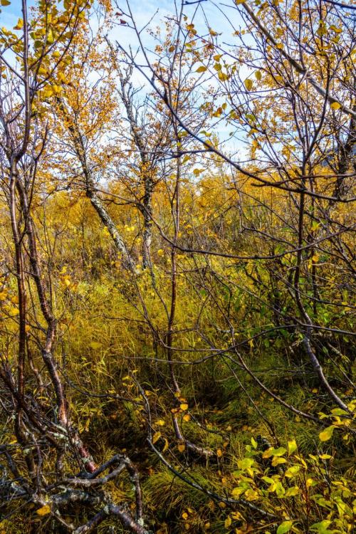 9. Etappe: Niják bis Kisurisstugan Am Morgen hatte ich zwei Eiterstellen an den Füßen entdeckt. Die eine am linken Knöchel, an einer alten Narbe, und die andere am rechten Fuß. Da hatte ich mir am zweiten Tag einen Zeh am Fels leicht aufgeschramt, also nur ein kleiner Kratzer. Zuerst konnte ich mir beide Eiterstellen nicht erklären, insbesondere die am linken Knöchel. Dann hatte ich aber bemerkt, dass es von den Neoprensocken kam. Über beide Stellen lief genau eine breite Naht und hatte an den Stellen gescheuert und in Verbindung mit der ständigen Feuchtigkeit kam es zu den Eiterstellen. Nachdem ich die Stellen jeden Tag mit Jod behandelt hatte, waren sie schnell abgeklungen. Bei den Pflasterstreifen fühlte ich mich ein wenig stuipd-light. Beim Packen hatte ich nämlich min. die Hälfte der Pflasterstreifen rausgenommen, da ich dachte, dass ich niemals so viele Wunden haben werde. Allerdings hatte ich dabei nicht berücksichtigt, dass man ja, insbesondere bei der Feuchtigkeit, jeden Tag ein neues benötigt. Na ja, zum Glück bin ich gerade so hingekommen. Der rechte Fuß ist jetzt sichtbar geschwollen, aber das Laufen ging erstaunlich gut. Dafür schmerzte jetzt das linke Handgelenk … Ich hatte oft den Trekkingstock nicht richtig gehalten bzw. gegriffen, sondern die Hand in der Schlaufe Hängen lassen. Schwierig zu beschreiben. Jedenfalls war das voll dämlich von mir, da somit eine Sehnenscheidenentzündung vorprogrammiert war. Rollbewegungen gingen gar nicht mehr, wie zum Beispiel Isomatte einrollen, etc. Zum Glück störte es nicht allzu sehr, da ich die Hand ja gut entbehren und somit schonen konnte. Die Landschaft wurde zunehmend flacher und es mehrten sich knallrote Birkenwälder. Leider war das Licht und die Landschaft so uninteressant, dass mir kein gutes Foto gelang. Direkt aus einem Gletscher umringten Tal kommend, wirkte die Landschaft eher langweilig. Kurz vor dem Padjelantaleden wurde es wieder deutlich interessanter. Man läuft zwischen zwei großen Strömen entlang und kommt in wunderschöne Birkenwäldchen mit grün leuchtenden Lichtungen. Es hatte irgendwie was Märchenhaftes. Eigentlich hatte ich erwartet eine ranzige Hütte in Kisurisstugan vorzufinden. Aber dort angekommen, musste ich feststellen, dass da ja eine moderne Ferienanlage, bestehend aus 6-8 Häusern, steht. Zu dieser Zeit war sie natürlich geschlossen und es war „nur“ eine Hütte offen. Diese war regelrecht luxuriös mit Solarstrom und Gasheizung ausgestattet. Beim Eintreten und Ablegen des Rucksacks viel plötzlich so einiges ab und es machte sich Erschöpfung breit. Es fühlte sich ein wenig an, wie wenn ich eben von einer langen Wanderung zu Hause angekommen wäre.